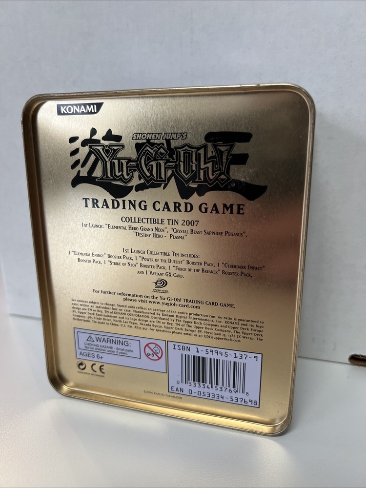 This YUGIOH 2007 Destiny Hero Plasma collectable tin is a must-have for any fan of the game. Although it is empty, it is a great addition to any collection. The tin features the iconic Destiny Hero Plasma character and is in great shape. Perfect for storing your own collectables or as a display piece, this tin is a rare find and a great addition to any YUGIOH collection. Don't miss your chance to own this unique piece of memorabilia.