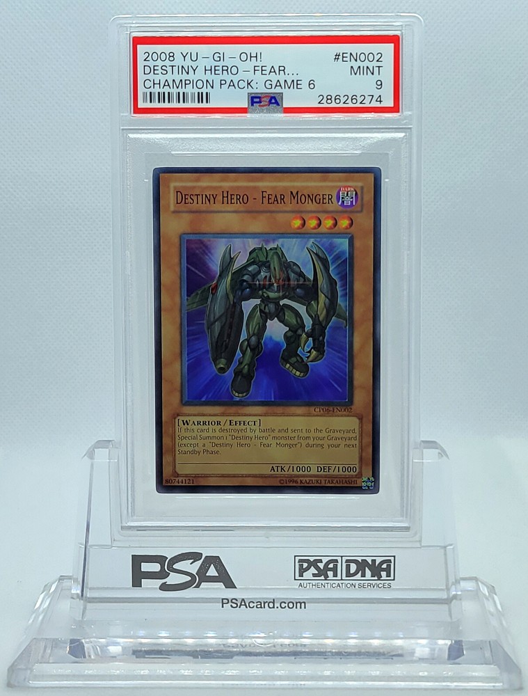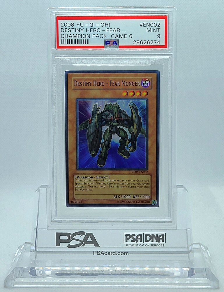 Description Condition: PSA 9 MINT Availability: In Stock You are Purchasing YUGIOH CP06-EN002 DESTINY HERO FEAR MONGER SUPER RARE HOLO PSA 9 MINT #28626274 Professionally graded by Professional Sports Authenticator (PSA) *PLEASE REVIEW PHOTO(S) BEFORE BIDDING/BUYING. >>MORE GRADED YUGIOH CARDS<< IG: CARD_RUSH_INC Payment Options Payment is expected within 7 days of your purchase date. We accept all forms of payments through Paypal. Shipping and Handling We ship to all U.S. states, U.S. territories, APO/FPO locations and any international countries listed under our "ship to" heading. Shipping and Handling is calculated based on the combined shipping weight of your item(s). Please use the shipping calculator to estimate your shipping and handling charges. In order to qualify for combined shipping terms, all items must be paid for in one payment; please do not pay until you are done bidding/shopping. Please contact us if you have any questions regarding our shipping and handling terms. Shipping and Delivery Packages are shipped out every Monday, Wednesday, and Friday. Domestic Packages take approximately 2-7 days to arrive. International packages may take a little longer to arrive, typically 1-4 weeks. Please allow ample transit times before inquiring about your package, thank you. Sales Tax Sales tax will be automatically collected by Ebay. Customer Service We will make every effort to get your purchase is mailed in a timely manner. Please contact us if you have any questions or concerns; we would love to hear any suggestions you have on how we can improve your eBay experience. Thank you for visiting us today.