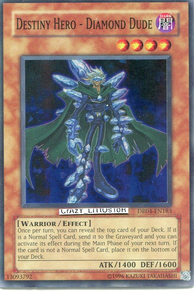 ***YU-GI-OH*** ***DESTINY HERO - DIAMOND DUDE*** **SUPER RARE** **UNLIMITED EDITION** **HOLOGRAPHIC** **EXCLUSIVE DARK REVOLUTION VOL.4 DR04-EN183** **N/MINT CONDITION** WELCOME TO CRAZY_LITTOSTORE ! TO MAKE YOUR PURCHASE AS SIMPLE AND EASY AS POSSIBLE, PLEASE REFER TO THE DETAILED STORE POLICIES LISTED BELOW. PLEASE REVIEW OUR TERMS BEFORE BIDDING. PLACING A BID ON OUR AUCTION IS YOUR ACCEPTANCE OF THESE TERMS. WITHIN 48 HOURS OF WINNING AN ITEM IN AUCTION OR COMPLETING A BUY IT NOW PURCHASE, COMPLETE THE CHECK OUT NOW PART OF THE TRANSACTION. WE HAVE UNPAID ASSISTANT TO OPEN OR CLOSE THE CASES ON OUR BEHALF. SO THE SYSTEM WILL BE AUTOMATICALLY OPEN CASES IF THE PAYMENT ISN'T RECEIVED WITHIN 7 DAYS OF THE CLOSE OF THE SALE. THE AUCTION WILL ALSO BE VOIDED AND A NON-PAYING ALERT WILL BE FILED WITH EBAY. WE ACCEPT PAYMENT THROUGH PAYPAL: DUE TO EBAY POLICIES, YOU ARE NOW ONLY HAVE ONE PAYMENT OPTION. CUSTOMER SERVICE: WHY CHOOSE US? OUR CUSTOMERS KNOW THAT WE ARE AN HONEST, TRUSTWORTHY SELLER THAT IS COMMITTED TO SATISFACTION BY PROVIDING HIGH QUALITY PRODUCTS AND STELLAR CUSTOMER SERVICE. CUSTOMER SATISFACTION IS OUR # 1 GOAL! DON'T HESITATE TO CONTACT US WITH ANY QUESTIONS OR CONCERNS. SHIPPING: WE WILL BE SECURELY SHIPPED YOUR ORDER WITH TRACKING CONFIRMATION NUMBER WITHIN 24 HOURS AFTER THE PAYMENT COMPLETED BY PAYPAL SYSTEM (MONDAY THROUGH SATURDAY), IF USED PAYPAL FOR YOUR PAYMENT METHOD. IMPORT DUTIES, TAXES AND CHARGES ARE NOT INCLUDED IN THE ITEM PRICE OR SHIPPING FEES. THESE CHARGES ARE THE BUYER RESPONSIBILITY. PLEASE CHECK WITH YOUR COUNTRY'S CUSTOMS OFFICE TO DETERMINE FOR WHAT THESE ADDITIONAL COSTS WILL BE PRIOR TO YOUR BIDDING/BUYING. THESE CHARGES ARE NORMALLY COLLECTED BY THE DELIVERY FREIGHT (SHIPPING) COMPANY OR WHEN YOU PICK UP THE ITEM. PLEASE DO NOT CONFUSE THEM FOR ADDITIONAL SHIPPING CHARGES. WE DO NOT MARK MERCHANDISE VALUES BELOW ITS VALUE OR MARK ITEMS AS "GIFTS". US AND INTERNATIONAL GOVERNMENT REGULATIONS HAS PROHIBITED SUCH BEHAVIOR. USPS FIRST CLASS MAIL = $2.61 =========>>>>> INT'L USPS FIRST CLASS = $13.05 USPS PRIORITY MAIL = $4.95 ==========>>>> INT'L PRIORITY MAIL = $28.95 USPS EXPRESS MAIL = $18.95 ===========>>>> INT'L EXPRESS MAIL = $45.95 WE WILL COMBINE SHIPPING FOR MULTIPLE PURCHASE $.50 EACH ADDITIONAL ITEM.... RETURNS: ITEMS THAT ARE SOLD ARE GUARANTEED AGAINST DOA (DEAD-ON ARRIVAL). IT IS THE BUYER'S RESPONSIBILITY TO CONTACT US BY E-MAIL WITHIN 48 HOURS OF PRODUCTS DELIVERY IF AN ITEM IS DEFECTIVE. OTHERWISE, THE DOA GUARANTEE EXPIRES. PRODUCTS CANNOT BE RETURNED OF REASONS OTHER THAN DEFECTIVENESS. YOUR MONEY WILL BE GLADLY REFUNDED IF RETURNED IN ORIGINAL CONDITION. BUYER IS RESPONSIBLE FOR ALL SHIPPING CHARGES OF RETURN ITEMS AND SHIPPING CHARGES ARE NON-REFUNDABLE. THIS RETURN POLICIES DOES NOT APPLY TO AUTOMOBILES. DON'T MISS OUT ON THIS GREAT DEAL! DON'T HESITATE......... BID NOW !!! THANKS FOR BIDDING AND GOOD LUCK !!!!