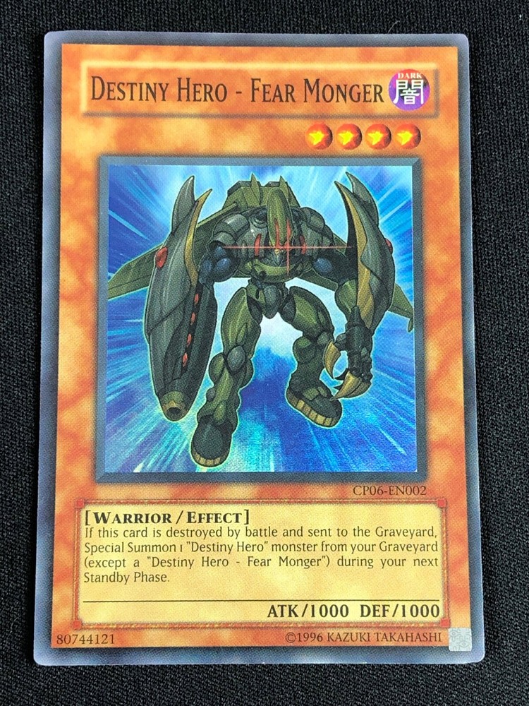 YUGIOH DESTINY HERO FEAR MONGER CP06-EN002 SUPER (MP) ALL CARDS IN THIS AUCTION ARE IN NEAR MINT TO MINT CONDITION UNLESS STATED OTHERWISE IN THE TITLE. AND, YOU ARE GUARANTEED TO RECEIVE THE CARD NAMED IN THE TITLE. PLEASE NOTE, IF THERE'S MORE THAN 1 COPY AVAILABLE, YOU MAY NOT RECIEVE THE SAME EXACT CARD IN THE PHOTO. HOWEVER, IT WILL BE THE SAME EXACT CARD IN THE TITLE, AND DESCRIPTION! PLEASE CONTACT ME IF THERE IS ANYTHING WRONG WITH YOUR ORDER OR SHIPPING BEFORE LEAVING FEEDBACK. PLEASE GIVE ME A CHANCE TO FIX ANY PROBLEM YOU MAY HAVE. THANK YOU! Shipping Information: Shipping and Handling for this auction will be Free inside the United States - With Tracking! International Shipping Available Through Ebay’s Global Shipping Program. (BUYER IS RESPONSIBLE FOR ANY TAX) **Read the TITLE to see the condition of the cards Before you place a bid. Any damaged cards will be listed as such In The Title (FOR EXAMPLE: Blue Eyes White Dragon LOB-001 (HP) If it doesn't say anything about damage, it is in near-mint to mint condition. If you have any questions, message me Before you place your bid.** *PLEASE READ* Ebay's Card Condition Guidelines: (NM) = Near mint or better Comparable to a fresh pack Flaws may include Minor corner and edge wear (LP) = Lightly played (Excellent) Has clearly visible signs of wear Flaws may include Moderate edge chipping Moderate surface scuffing Fuzzy corners (MP) = Moderately played (Very good) Has moderate-to-heavy damage all over Flaws may include Moderate discoloration Moderate creasing Moderate to heavy edge chipping Rounding and soft corner (HP) = Heavily played (Poor) Is extremely worn and displays flaws all over Heavily Played condition cards exhibit signs of heavy wear. Heavily Played condition cards may include cards that have significant creasing, folding, severe water damage, heavy whitening, heavy border wear, and/or tearing. RETURN POLICY: RETURNS ARE ACCEPTED IF THE ITEM ARRIVES DAMAGED, OR NOT AS DESCRIBED. RETURNS ARE NOT ACCEPTED FOR BUYERS REMORSE. CHECK OUT MY OTHER AUCTIONS! _gsrx_vers_1600 (GS 9.5a1 (1600))