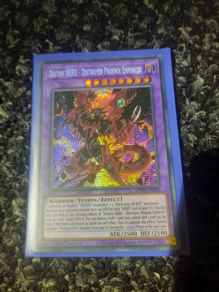YUGIOH DESTINY HERO-DESTROYER PHOENIX ENFORCER SECRET 1ST NEAR MINT MP22-EN209. Condition is Ungraded. Dispatched with Royal Mail 2nd Class Letter....