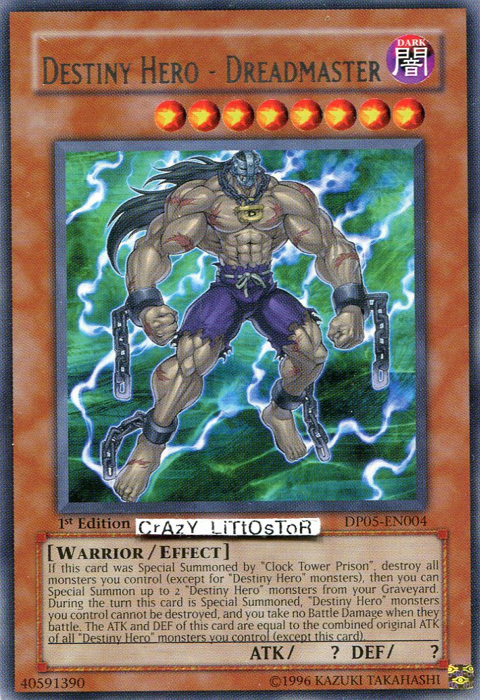 **YU-GI-OH** **DESTINY HERO-DREADMASTER** **SILVER RARE** **1ST EDITION** **NON-HOLOGRAPHIC** **DUELIST PACK VOL.5 DP05-EN004** **N/MINT CONDITION** W ELCOME TO CRAZY_LITTOSTORE ! TO MAKE YOUR PURCHASE AS SIMPLE AND EASY AS POSSIBLE, PLEASE REFER TO THE DETAILED STORE POLICIES LISTED BELOW. PLEASE REVIEW OUR TERMS BEFORE BIDDING. PLACING A BID ON OUR AUCTION IS YOUR ACCEPTANCE OF THESE TERMS. WITHIN 48 HOURS OF WINNING AN ITEM IN AUCTION OR COMPLETING A BUY IT NOW PURCHASE, COMPLETE THE CHECK OUT NOW PART OF THE TRANSACTION. WE HAVE UNPAID ASSISTANT TO OPEN OR CLOSE THE CASES ON OUR BEHALF. SO THE SYSTEM WILL BE AUTOMATICALLY OPEN CASES IF THE PAYMENT ISN'T RECEIVED WITHIN 7 DAYS OF THE CLOSE OF THE SALE. THE AUCTION WILL ALSO BE VOIDED AND A NON-PAYING ALERT WILL BE FILED WITH EBAY. WE ACCEPT PAYMENT THROUGH PAYPAL: DUE TO EBAY POLICIES, YOU ARE NOW ONLY HAVE ONE PAYMENT OPTION. CUSTOMER SERVICE: WHY CHOOSE US? OUR CUSTOMERS KNOW THAT WE ARE AN HONEST, TRUSTWORTHY SELLER THAT IS COMMITTED TO SATISFACTION BY PROVIDING HIGH QUALITY PRODUCTS AND STELLAR CUSTOMER SERVICE. CUSTOMER SATISFACTION IS OUR # 1 GOAL! DON'T HESITATE TO CONTACT US WITH ANY QUESTIONS OR CONCERNS. SHIPPING: WE WILL BE SECURELY SHIPPED YOUR ORDER WITH TRACKING CONFIRMATION NUMBER WITHIN 24 HOURS AFTER THE PAYMENT COMPLETED BY PAYPAL SYSTEM (MONDAY THROUGH SATURDAY), IF USED PAYPAL FOR YOUR PAYMENT METHOD. IMPORT DUTIES, TAXES AND CHARGES ARE NOT INCLUDED IN THE ITEM PRICE OR SHIPPING FEES. THESE CHARGES ARE THE BUYER RESPONSIBILITY. PLEASE CHECK WITH YOUR COUNTRY'S CUSTOMS OFFICE TO DETERMINE FOR WHAT THESE ADDITIONAL COSTS WILL BE PRIOR TO YOUR BIDDING/BUYING. THESE CHARGES ARE NORMALLY COLLECTED BY THE DELIVERY FREIGHT (SHIPPING) COMPANY OR WHEN YOU PICK UP THE ITEM. PLEASE DO NOT CONFUSE THEM FOR ADDITIONAL SHIPPING CHARGES. WE DO NOT MARK MERCHANDISE VALUES BELOW ITS VALUE OR MARK ITEMS AS "GIFTS". US AND INTERNATIONAL GOVERNMENT REGULATIONS HAS PROHIBITED SUCH BEHAVIOR. USPS FIRST CLASS MAIL = $2.61 =========>>>>> INT'L USPS FIRST CLASS = $13.05 USPS PRIORITY MAIL = $4.95 ==========>>>> INT'L PRIORITY MAIL = $28.95 USPS EXPRESS MAIL = $18.95 ===========>>>> INT'L EXPRESS MAIL = $45.95 WE WILL COMBINE SHIPPING FOR MULTIPLE PURCHASE $.50 EACH ADDITIONAL ITEM.... RETURNS: ITEMS THAT ARE SOLD ARE GUARANTEED AGAINST DOA (DEAD-ON ARRIVAL). IT IS THE BUYER'S RESPONSIBILITY TO CONTACT US BY E-MAIL WITHIN 48 HOURS OF PRODUCTS DELIVERY IF AN ITEM IS DEFECTIVE. OTHERWISE, THE DOA GUARANTEE EXPIRES. PRODUCTS CANNOT BE RETURNED OF REASONS OTHER THAN DEFECTIVENESS. YOUR MONEY WILL BE GLADLY REFUNDED IF RETURNED IN ORIGINAL CONDITION. BUYER IS RESPONSIBLE FOR ALL SHIPPING CHARGES OF RETURN ITEMS AND SHIPPING CHARGES ARE NON-REFUNDABLE. THIS RETURN POLICIES DOES NOT APPLY TO AUTOMOBILES. DON'T MISS OUT ON THIS GREAT DEAL! DON'T HESITATE......... BID NOW !!! THANKS FOR BIDDING AND GOOD LUCK !!!!