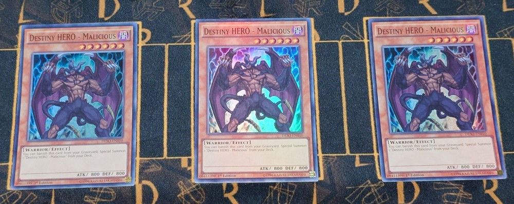 3 Super Rare Destiny HERO - Malicious (DESO-EN010) 1st Edition Condition: Near Mint Condition Cards will be sent with a rigid toploader for maximum protection Please feel free to take a look at my other items =) Please contact me if you require additional photos or have any questions about the item. Please let me know if you are not completely satisfied with your purchase before leaving feedback so we can attempt to resolve the situation. Thanks for looking =]