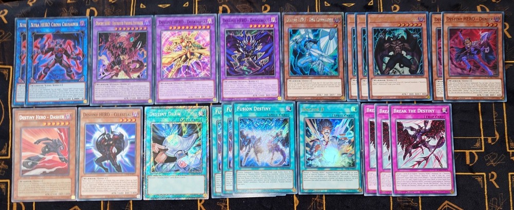 21 Yu-Gi-Oh cards including Destiny HERO Starter base. Condition: Near Mint Condition Monsters(13) ( Platinum Secret Rare ) Destiny HERO - Disk Commander x1 (Ultra Rare) Destiny HERO - Malicious x3 (Ultra Rare) Xtra HERO Cross Crusader x2 (Ultra Rare) Destiny HERO - Destroyer Phoenix Enforcer x1 (Super Rare) Destiny HERO - Denier x2 (Rare) Destiny HERO - Dasher x1 Destiny HERO - Dusktopia x1 Destiny HERO - Dangerous x1 Destiny HERO - Celestial x1 Spells(5) ( Platinum Secret Rare) Destiny Draw x1 ( Secret Rare) Fusion Destiny x3 ( Ultra Rare) Doctor D x1 Traps(3) Break the Destiny x3 Cards will be sent with a rigid toploader for maximum protection Please feel free to take a look at my other items =) Please contact me if you require additional photos or have any questions about the item. Please let me know if you are not completely satisfied with your purchase before leaving feedback so we can attempt to resolve the situation. Thanks for looking =]