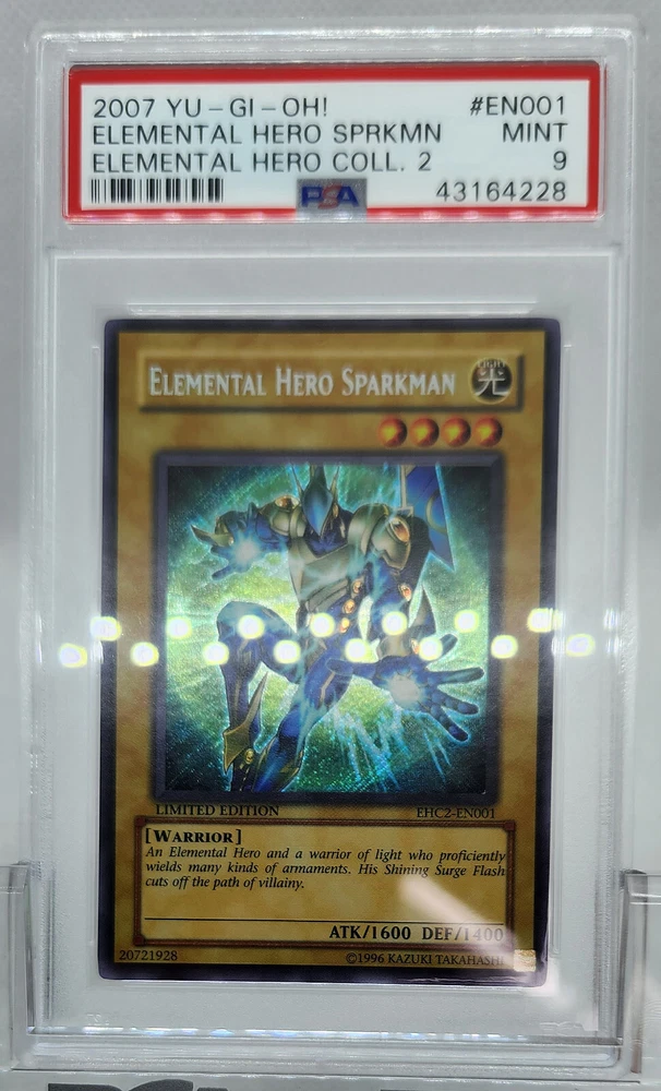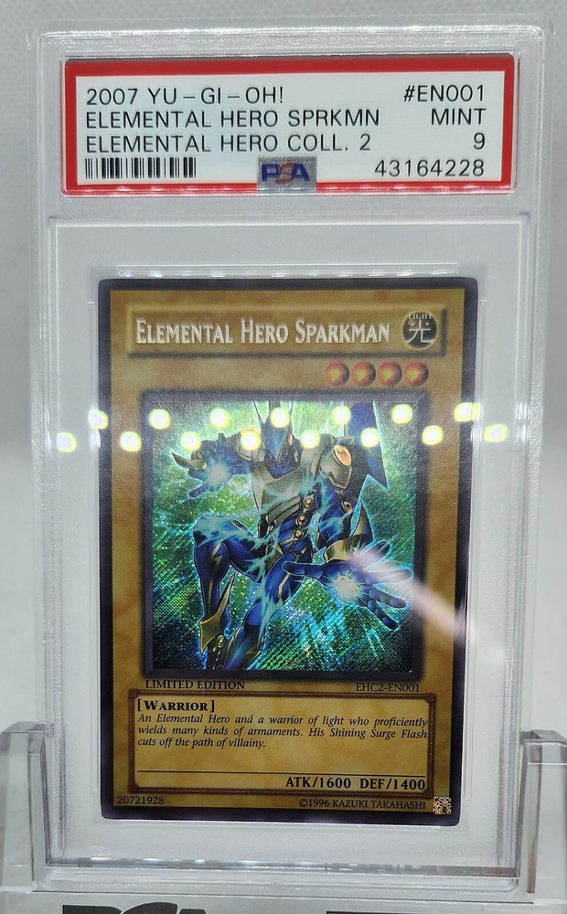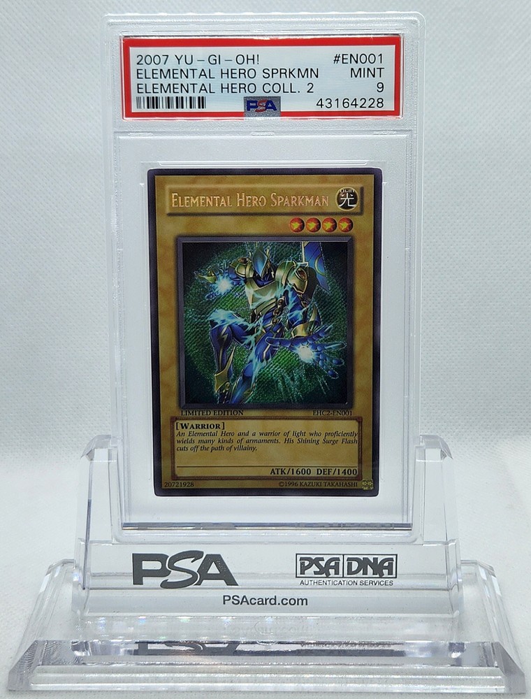 Description Condition: PSA 9 MINT Availability: In Stock You are Purchasing YUGIOH EHC2-EN001 ELEMENTAL HERO SPARKMAN SECRET RARE HOLO PSA 9 MINT #43164228 Professionally graded by Professional Sports Authenticator (PSA) *PLEASE REVIEW PHOTO(S) BEFORE BIDDING/BUYING. >>MORE GRADED YUGIOH CARDS<< IG: CARD_RUSH_INC Payment Options Payment is expected within 7 days of your purchase date. We accept all forms of payments through Paypal. Shipping and Handling We ship to all U.S. states, U.S. territories, APO/FPO locations and any international countries listed under our "ship to" heading. Shipping and Handling is calculated based on the combined shipping weight of your item(s). Please use the shipping calculator to estimate your shipping and handling charges. In order to qualify for combined shipping terms, all items must be paid for in one payment; please do not pay until you are done bidding/shopping. Please contact us if you have any questions regarding our shipping and handling terms. Shipping and Delivery Packages are shipped out every Monday, Wednesday, and Friday. Domestic Packages take approximately 2-7 days to arrive. International packages may take a little longer to arrive, typically 1-4 weeks. Please allow ample transit times before inquiring about your package, thank you. Sales Tax Sales tax will be automatically collected by Ebay. Customer Service We will make every effort to get your purchase is mailed in a timely manner. Please contact us if you have any questions or concerns; we would love to hear any suggestions you have on how we can improve your eBay experience. Thank you for visiting us today.