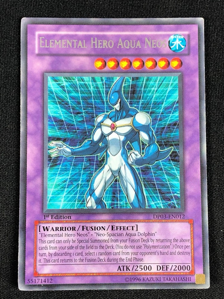 YUGIOH ELEMENTAL HERO AQUA NEOS DP03-EN012 1ST RARE(MP) ALL CARDS IN THIS AUCTION ARE IN NEAR MINT TO MINT CONDITION UNLESS STATED OTHERWISE IN THE TITLE. AND, YOU ARE GUARANTEED TO RECEIVE THE CARD NAMED IN THE TITLE. PLEASE NOTE, IF THERE'S MORE THAN 1 COPY AVAILABLE, YOU MAY NOT RECIEVE THE SAME EXACT CARD IN THE PHOTO. HOWEVER, IT WILL BE THE SAME EXACT CARD IN THE TITLE, AND DESCRIPTION! PLEASE CONTACT ME IF THERE IS ANYTHING WRONG WITH YOUR ORDER OR SHIPPING BEFORE LEAVING FEEDBACK. PLEASE GIVE ME A CHANCE TO FIX ANY PROBLEM YOU MAY HAVE. THANK YOU! Shipping Information: Shipping and Handling for this auction will be Free inside the United States - With Tracking! International Shipping Available Through Ebay’s Global Shipping Program. (BUYER IS RESPONSIBLE FOR ANY TAX) **Read the TITLE to see the condition of the cards Before you place a bid. Any damaged cards will be listed as such In The Title (FOR EXAMPLE: Blue Eyes White Dragon LOB-001 (HP) If it doesn't say anything about damage, it is in near-mint to mint condition. If you have any questions, message me Before you place your bid.** *PLEASE READ* Ebay's Card Condition Guidelines: (NM) = Near mint or better Comparable to a fresh pack Flaws may include Minor corner and edge wear (LP) = Lightly played (Excellent) Has clearly visible signs of wear Flaws may include Moderate edge chipping Moderate surface scuffing Fuzzy corners (MP) = Moderately played (Very good) Has moderate-to-heavy damage all over Flaws may include Moderate discoloration Moderate creasing Moderate to heavy edge chipping Rounding and soft corner (HP) = Heavily played (Poor) Is extremely worn and displays flaws all over Heavily Played condition cards exhibit signs of heavy wear. Heavily Played condition cards may include cards that have significant creasing, folding, severe water damage, heavy whitening, heavy border wear, and/or tearing. RETURN POLICY: RETURNS ARE ACCEPTED IF THE ITEM ARRIVES DAMAGED, OR NOT AS DESCRIBED. RETURNS ARE NOT ACCEPTED FOR BUYERS REMORSE. CHECK OUT MY OTHER AUCTIONS! _gsrx_vers_1652 (GS 9.7.4 (1652))