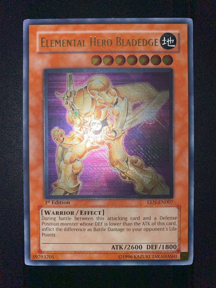 This card is a must-have for any serious Yu-Gi-Oh! collector! The Ultimate Rare finish looks stunning, and the 1st Edition stamp adds serious value. The card arrived in perfect near-mint condition, just as described. The holographic details pop, making Bladedge look even more powerful. Super rare find from the 2005 Elemental Energy set - super happy with this purchase! Shipping was fast and the card was well-protected. Definitely worth adding to your Hero deck or display collection!
