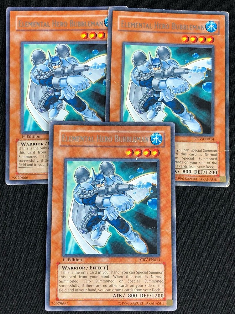 YUGIOH ELEMENTAL HERO BUBBELMAN CRV-014 1ST RARE X3(HP) ALL CARDS IN THIS AUCTION ARE IN NEAR MINT TO MINT CONDITION UNLESS STATED OTHERWISE IN THE TITLE. AND, YOU ARE GUARANTEED TO RECEIVE THE CARD NAMED IN THE TITLE. PLEASE NOTE, IF THERE'S MORE THAN 1 COPY AVAILABLE, YOU MAY NOT RECIEVE THE SAME EXACT CARD IN THE PHOTO. HOWEVER, IT WILL BE THE SAME EXACT CARD IN THE TITLE, AND DESCRIPTION! PLEASE CONTACT ME IF THERE IS ANYTHING WRONG WITH YOUR ORDER OR SHIPPING BEFORE LEAVING FEEDBACK. PLEASE GIVE ME A CHANCE TO FIX ANY PROBLEM YOU MAY HAVE. THANK YOU! Shipping Information: Shipping and Handling for this auction will be Free inside the United States - With Tracking! International Shipping Available Through Ebay’s Global Shipping Program. (BUYER IS RESPONSIBLE FOR ANY TAX) **Read the TITLE to see the condition of the cards Before you place a bid. Any damaged cards will be listed as such In The Title (FOR EXAMPLE: Blue Eyes White Dragon LOB-001 (HP) If it doesn't say anything about damage, it is in near-mint to mint condition. If you have any questions, message me Before you place your bid.** *PLEASE READ* Ebay's Card Condition Guidelines: (NM) = Near mint or better Comparable to a fresh pack Flaws may include Minor corner and edge wear (LP) = Lightly played (Excellent) Has clearly visible signs of wear Flaws may include Moderate edge chipping Moderate surface scuffing Fuzzy corners (MP) = Moderately played (Very good) Has moderate-to-heavy damage all over Flaws may include Moderate discoloration Moderate creasing Moderate to heavy edge chipping Rounding and soft corner (HP) = Heavily played (Poor) Is extremely worn and displays flaws all over Heavily Played condition cards exhibit signs of heavy wear. Heavily Played condition cards may include cards that have significant creasing, folding, severe water damage, heavy whitening, heavy border wear, and/or tearing. RETURN POLICY: RETURNS ARE ACCEPTED IF THE ITEM ARRIVES DAMAGED, OR NOT AS DESCRIBED. RETURNS ARE NOT ACCEPTED FOR BUYERS REMORSE. CHECK OUT MY OTHER AUCTIONS! _gsrx_vers_1634 (GS 9.6 (1634))