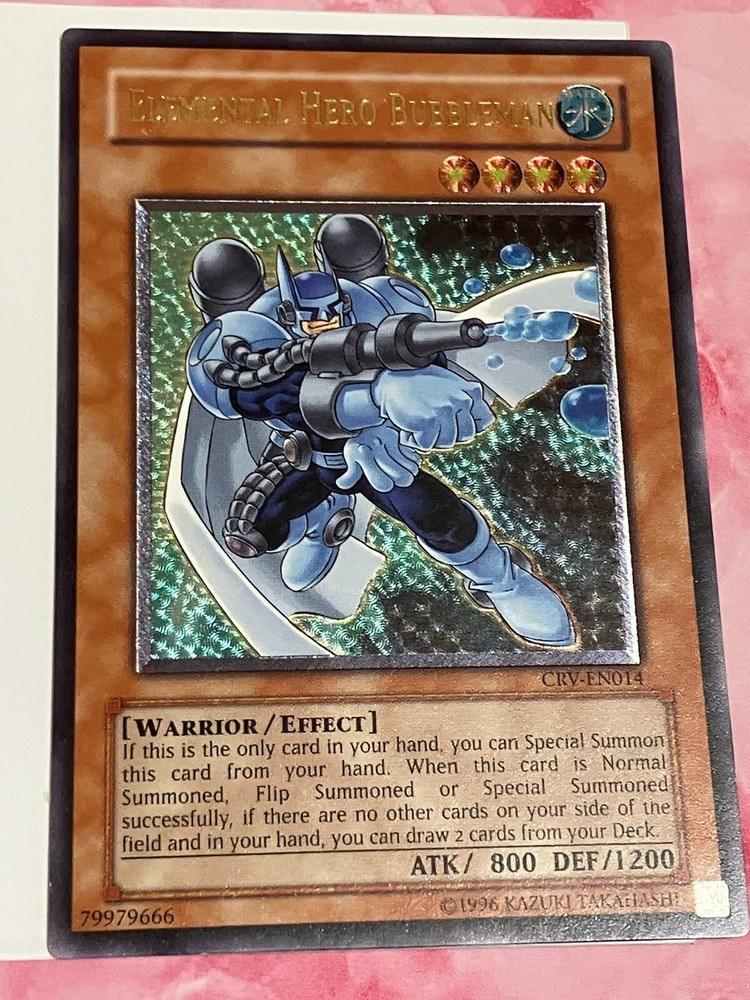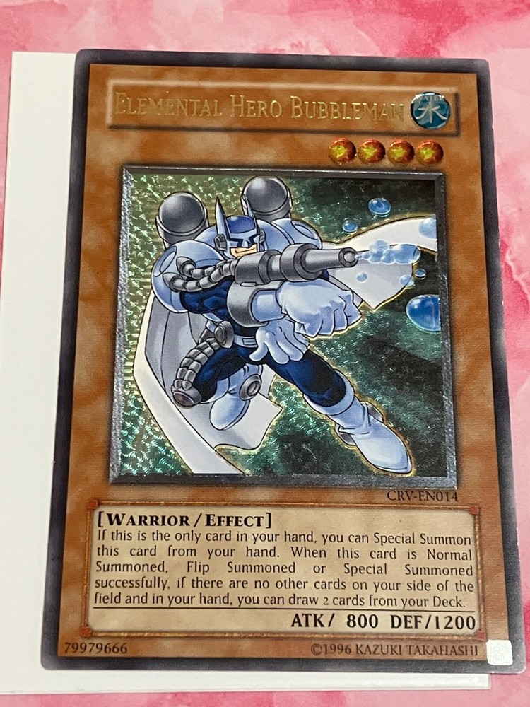 YUGIOH ELEMENTAL HERO BUBBLEMAN ULTIMATE RARE CRV-EN014 LP . Has some edge wear . Will be sent in a sleeve and toploader.