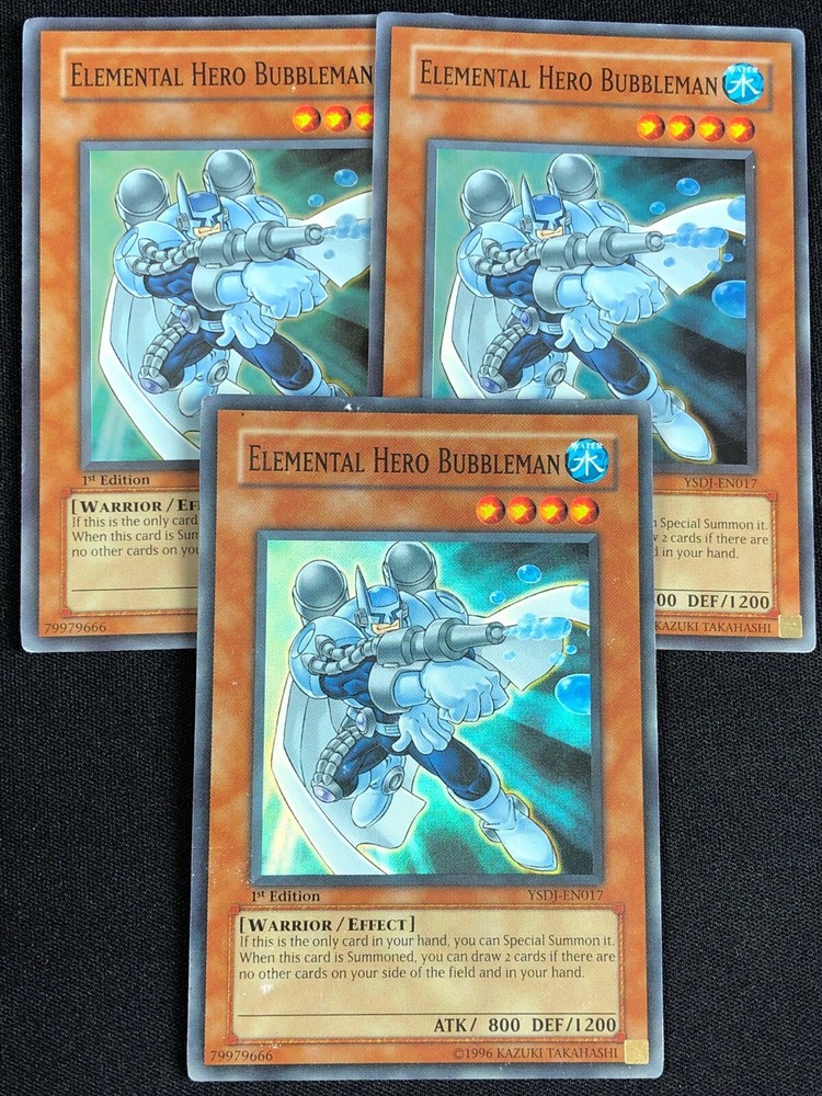 YUGIOH ELEMENTAL HERO BUBBLEMAN YSDJ-EN017 1ST SUPER X3 (MP) ALL CARDS IN THIS AUCTION ARE IN NEAR MINT TO MINT CONDITION UNLESS STATED OTHERWISE IN THE TITLE. AND, YOU ARE GUARANTEED TO RECEIVE THE CARD NAMED IN THE TITLE. PLEASE NOTE, IF THERE'S MORE THAN 1 COPY AVAILABLE, YOU MAY NOT RECIEVE THE SAME EXACT CARD IN THE PHOTO. HOWEVER, IT WILL BE THE SAME EXACT CARD IN THE TITLE, AND DESCRIPTION! PLEASE CONTACT ME IF THERE IS ANYTHING WRONG WITH YOUR ORDER OR SHIPPING BEFORE LEAVING FEEDBACK. PLEASE GIVE ME A CHANCE TO FIX ANY PROBLEM YOU MAY HAVE. THANK YOU! Shipping Information: Shipping and Handling for this auction will be Free inside the United States - With Tracking! International Shipping Available Through Ebay’s Global Shipping Program. (BUYER IS RESPONSIBLE FOR ANY TAX) **Read the TITLE to see the condition of the cards Before you place a bid. Any damaged cards will be listed as such In The Title (FOR EXAMPLE: Blue Eyes White Dragon LOB-001 (HP) If it doesn't say anything about damage, it is in near-mint to mint condition. If you have any questions, message me Before you place your bid.** *PLEASE READ* Ebay's Card Condition Guidelines: (NM) = Near mint or better Comparable to a fresh pack Flaws may include Minor corner and edge wear (LP) = Lightly played (Excellent) Has clearly visible signs of wear Flaws may include Moderate edge chipping Moderate surface scuffing Fuzzy corners (MP) = Moderately played (Very good) Has moderate-to-heavy damage all over Flaws may include Moderate discoloration Moderate creasing Moderate to heavy edge chipping Rounding and soft corner (HP) = Heavily played (Poor) Is extremely worn and displays flaws all over Heavily Played condition cards exhibit signs of heavy wear. Heavily Played condition cards may include cards that have significant creasing, folding, severe water damage, heavy whitening, heavy border wear, and/or tearing. RETURN POLICY: RETURNS ARE ACCEPTED IF THE ITEM ARRIVES DAMAGED, OR NOT AS DESCRIBED. RETURNS ARE NOT ACCEPTED FOR BUYERS REMORSE. CHECK OUT MY OTHER AUCTIONS! _gsrx_vers_1600 (GS 9.5a1 (1600))