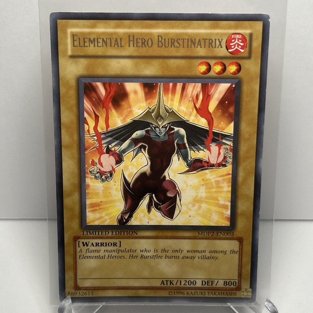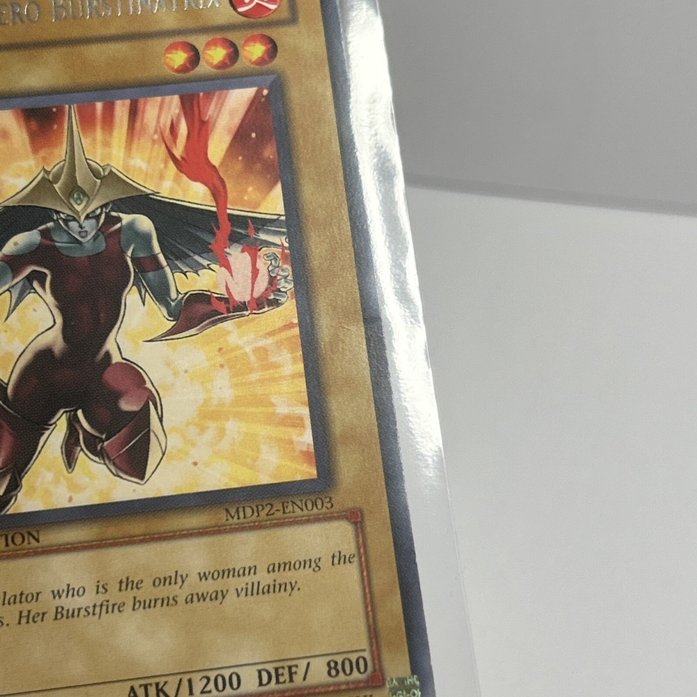 This is a Japanese-sized Yu-Gi-Oh! TCG card featuring the BREAK specialty and signed by 5ban Graphics. It depicts an Angel creature type, specifically the Elemental HERO Burstinatrix. The card is in lightly played condition and was manufactured in 1999, making it a vintage collectible. Authenticated by Professional Sports Authenticator (PSA) with the autograph authentication number YUGIOH, this aluminum card is part of the Yu-Gi-Oh! game series. MINOR CREASE see pics YG 107