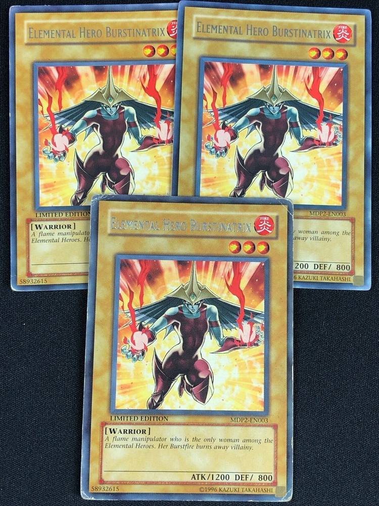YUGIOH ELEMENTAL HERO BURSTINATRIX MDP2-EN003 RARE X3 (HP) ALL CARDS IN THIS AUCTION ARE IN NEAR MINT TO MINT CONDITION UNLESS STATED OTHERWISE IN THE TITLE. AND, YOU ARE GUARANTEED TO RECEIVE THE CARD NAMED IN THE TITLE. PLEASE NOTE, IF THERE'S MORE THAN 1 COPY AVAILABLE, YOU MAY NOT RECIEVE THE SAME EXACT CARD IN THE PHOTO. HOWEVER, IT WILL BE THE SAME EXACT CARD IN THE TITLE, AND DESCRIPTION! PLEASE CONTACT ME IF THERE IS ANYTHING WRONG WITH YOUR ORDER OR SHIPPING BEFORE LEAVING FEEDBACK. PLEASE GIVE ME A CHANCE TO FIX ANY PROBLEM YOU MAY HAVE. THANK YOU! Shipping Information: Shipping and Handling for this auction will be Free inside the United States - With Tracking! International Shipping Available Through Ebay’s Global Shipping Program. (BUYER IS RESPONSIBLE FOR ANY TAX) **Read the TITLE to see the condition of the cards Before you place a bid. Any damaged cards will be listed as such In The Title (FOR EXAMPLE: Blue Eyes White Dragon LOB-001 (HP) If it doesn't say anything about damage, it is in near-mint to mint condition. If you have any questions, message me Before you place your bid.** *PLEASE READ* Ebay's Card Condition Guidelines: (NM) = Near mint or better Comparable to a fresh pack Flaws may include Minor corner and edge wear (LP) = Lightly played (Excellent) Has clearly visible signs of wear Flaws may include Moderate edge chipping Moderate surface scuffing Fuzzy corners (MP) = Moderately played (Very good) Has moderate-to-heavy damage all over Flaws may include Moderate discoloration Moderate creasing Moderate to heavy edge chipping Rounding and soft corner (HP) = Heavily played (Poor) Is extremely worn and displays flaws all over Heavily Played condition cards exhibit signs of heavy wear. Heavily Played condition cards may include cards that have significant creasing, folding, severe water damage, heavy whitening, heavy border wear, and/or tearing. RETURN POLICY: RETURNS ARE ACCEPTED IF THE ITEM ARRIVES DAMAGED, OR NOT AS DESCRIBED. RETURNS ARE NOT ACCEPTED FOR BUYERS REMORSE. CHECK OUT MY OTHER AUCTIONS! _gsrx_vers_1634 (GS 9.6 (1634))