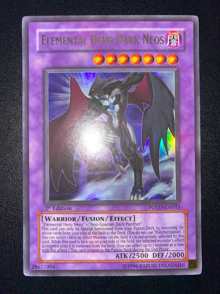 This Yu-Gi-Oh! Elemental HERO Dark Neos Ultra Rare card is a must-have for collectors! The 1st Edition print from Power of the Duelist (2006) looks stunning in Near Mint condition—crisp edges, vibrant artwork, and perfect foil shine. A fantastic addition to any HERO deck or display. Fast shipping and well-packaged—highly recommended for serious duelists!