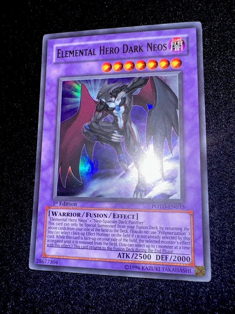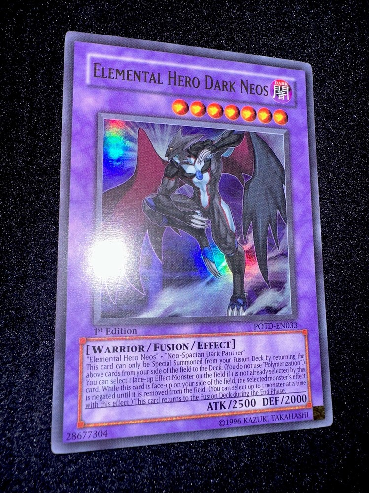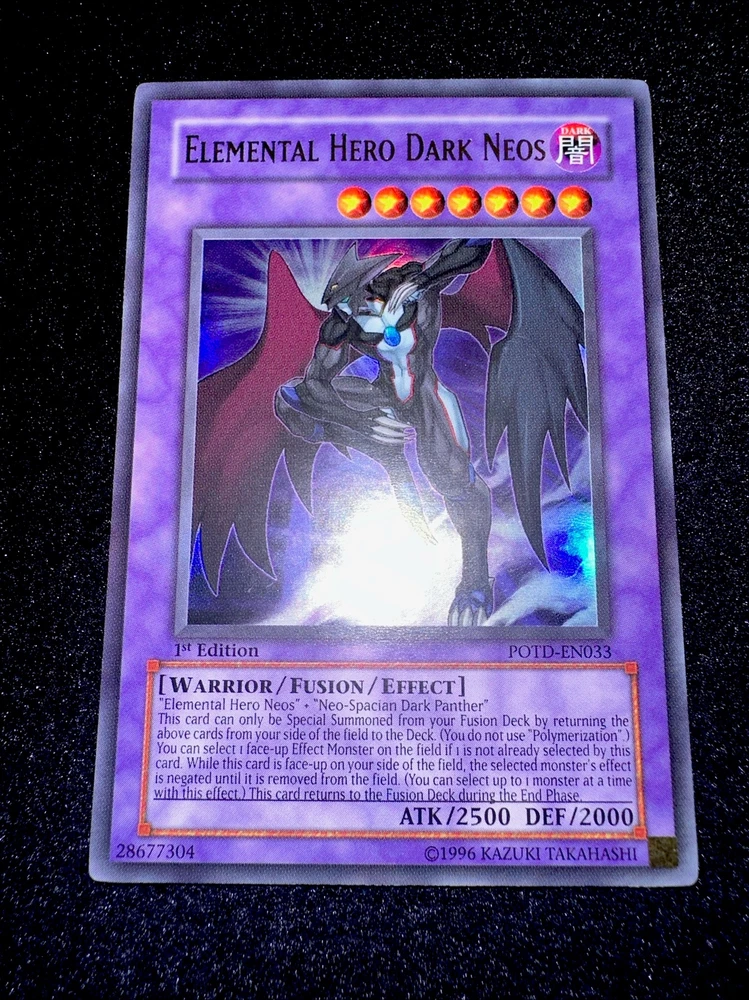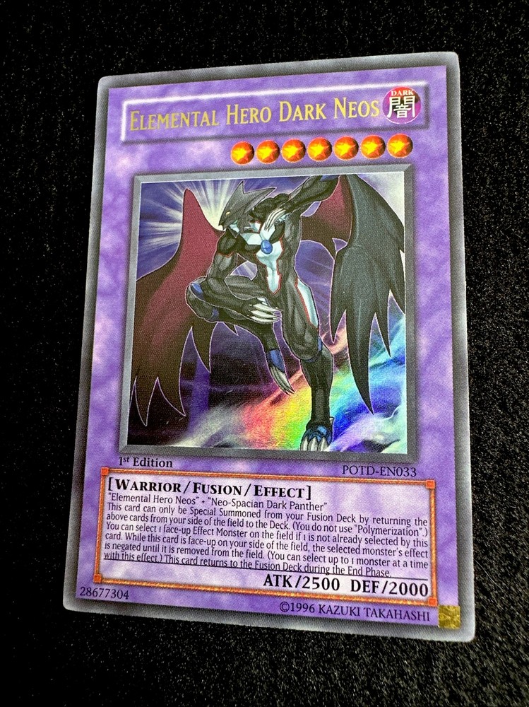 YUGIOH • ELEMENTAL HERO DARK NEOS • ULTRA RARE • POTD-EN033 • 1st EDITION • NM Card Sleeve Included + Top Loader • Never Play Near Mint card • Authentic Konami USA Version YOU ARE GUARANTEED TO GET THE CARD NAMED IN THE TITLE. Thank you.