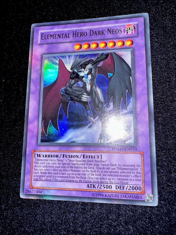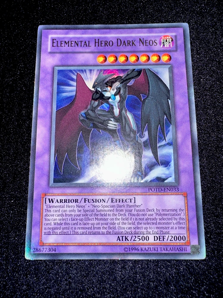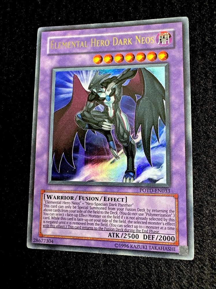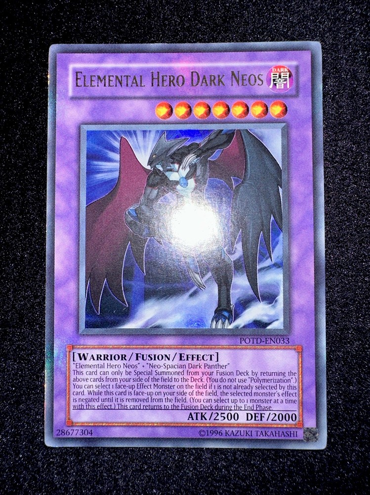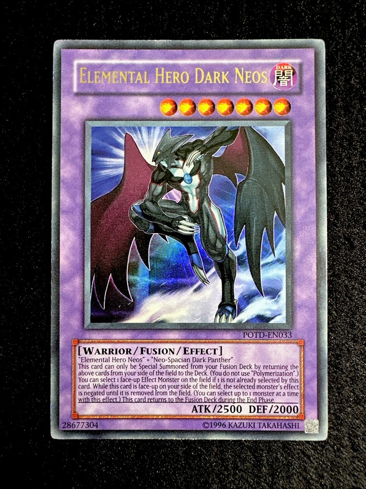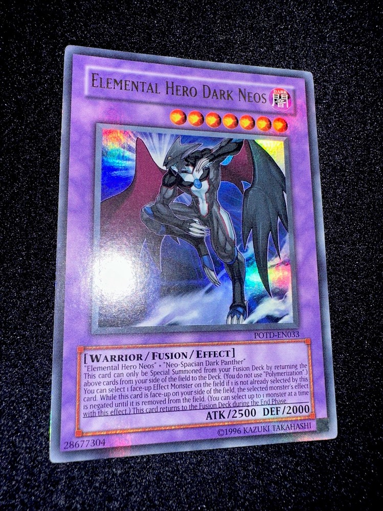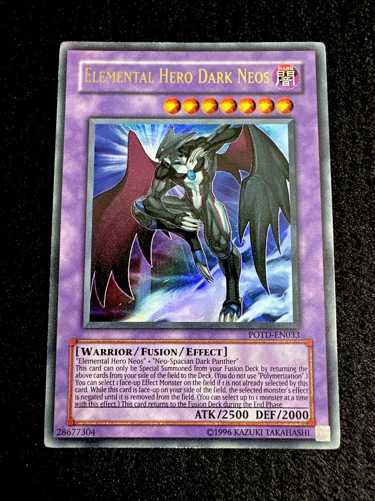 YUGIOH • ELEMENTAL HERO DARK NEOS • ULTRA RARE • POTD-EN033 • UNLIMITED • NM Card Sleeve Included + Top Loader • Never Play Near Mint card • Authentic Konami USA Version YOU ARE GUARANTEED TO GET THE CARD NAMED IN THE TITLE. Thank you.