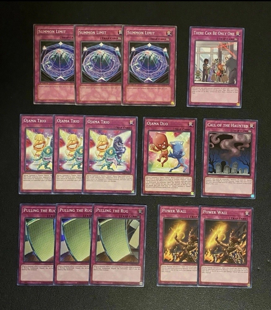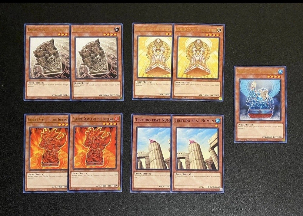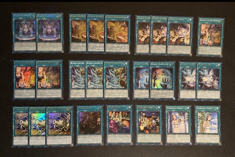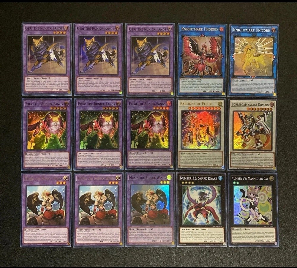 Yugioh Runick Stun Deck. Condition: Near Mint. Extra Deck: 3x Freki The Runick Fangs - Super Rare 3x Geri The Runick Fangs - Super Rare 3x Munin The Runick Wings - 2 Rare + 1 Super Rare 1x Borreload Savage Dragon - Super Rare 1x Baronne De Fleur - Ultra Rare 1x Number 29: Mannequin Cat - Super Rare 1x Number 32: Shark Drake - Common 1x Knightmare Phoenix - Ultra Rare 1x Knightmare Unicorn - Super Rare Monsters: 2x Testudo Erat Numen - Common 2x Barrier Statue of The Inferno - Rare 2x Barrier Statue of The Heavens - Rare 2x Barrier Statue of The Drought - Rare 1x Barrier Statue of The Torrent - Rare Spells: 2x Runick Fountain - Secret Rare 3x Runick Destruction - Ultra Rare 3x Runick Slumber - Rare 3x Runick Golden Droplet - 2 Ultra Rare + 1 Super Rare 3x Runick Smiting Storm - 1 Rare + 2 Common 2x Runick Dispelling - 1 Rare + 1 Super Rare 2x Runick Allure - Rare 3x Wave Motion Cannon - Ultra Rare 1x Spellbound - Ultra Rare 1x Shared Ride - Rare 1x Mistaken Arrest - Rare 1x Forbidden Dress - Common 1x Forbidden Lance - Common Traps: 3x Summon Limit - Common 1x There Can Be Only One - Common 3x Ojama Trio - Common 1x Ojama Duo - Common 1x Call of The Haunted - Common 3x Pulling The Rug - Super Rare 2x Power Wall - Common