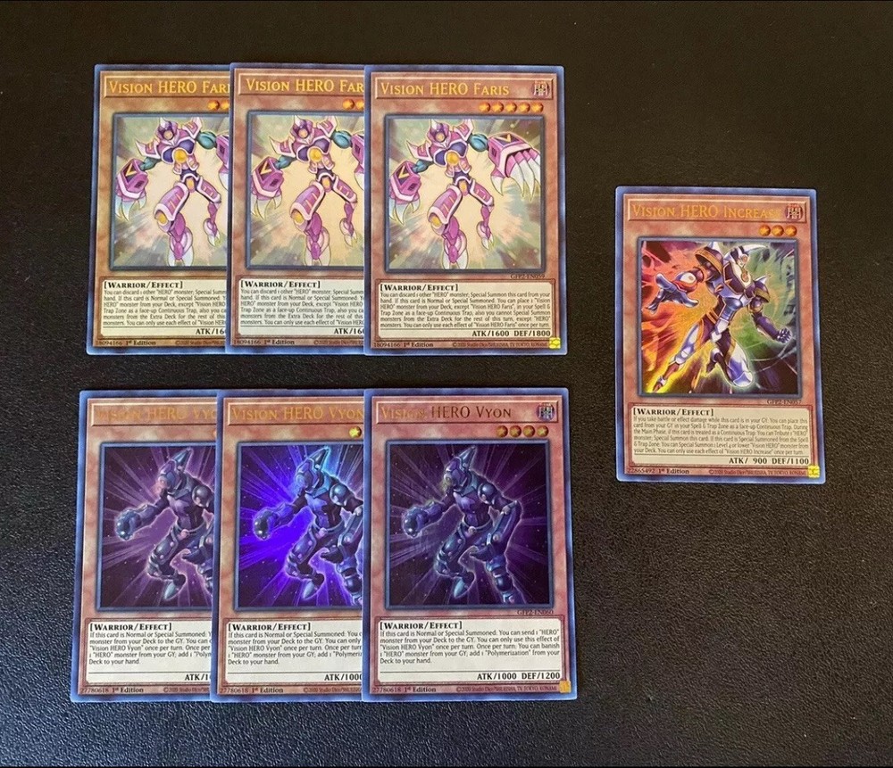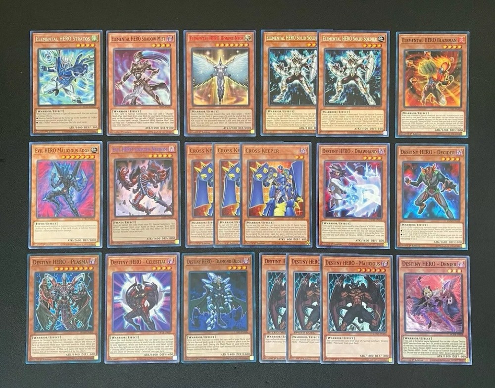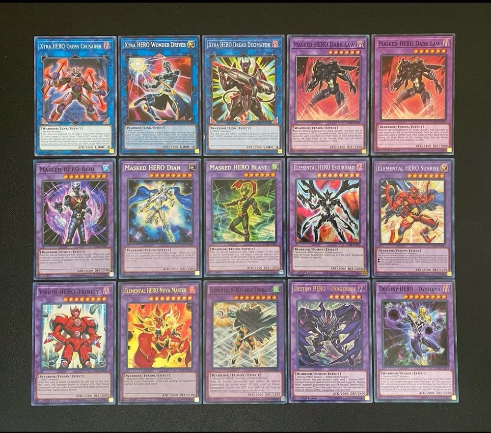 YUGIOH! NEAR MINT! High Rarity HERO Deck: EXTRA DECK: 1x Elemental Hero Sunrise - Secret Rare 1x Elemental Hero Escuridao - Secret Rare 1x Elemental Hero Nova Master - Ultra Rare 2x Masked Hero Dark Law - Common 1x Masked Hero Dian - Rare 1x Masked Hero Acid - Super Rare 1x Masked Hero Blast - Rare 1x Xtra Hero Wonder Driver - Ultra Rare 1x Xtra Hero Dread Decimator - Common 1x Xtra Hero Cross Crusader - Common 1x Vision Hero Trinity - Super Rare 1x Destiny Hero Dystopia - Common 1x Destiny Hero Dangerous - Ultra Rare 1x Elemental Hero Great Tornado - Common MONSTERS: 3x Vision Hero Faris - Ultra Rare 1x Vision Hero Increase - Ultra Rare 3x Vision Hero Vyon - Ultra Rare 1x Elemental Hero Stratos - Ultra Rare 1x Elemental Hero Honest Neos - Red Ultra Rare 1x Elemental Hero Shadow Mist - Super Rare 1x Destiny Hero Plasma - Common 1x Elemental Hero Blazeman - Common 2x Elemental Hero Solid Soldier - Rare 1x Evil Hero Sinister Necrom - Blue Ultra Rare 1x Evil Hero Malicious Edge - Common 3x Destiny Hero Malicious - Common 1x Destiny Hero Denier - Super Rare 1x Destiny Hero Celestial - Common 1x Destiny Hero Drawhand - Common 1x Destiny Hero - Decider - Common 1x Destiny Hero - Diamond Dude - Common 3x Cross Keeper - Common SPELLS: 3x Fusion Destiny - Common 3x E - Emergency Call - Common 3x A Hero Lives - Common 3x Mask Change - Common 3x EN Wave - Super Rare 1x Polymerization - Common 1x Miracle Fusion - Common 1x Reinforcement of The Army - Gold Rare 3x Favorite Hero - Common 1x Skyscraper - Common TRAPS: 1x Anti-Spell Fragrance - Common