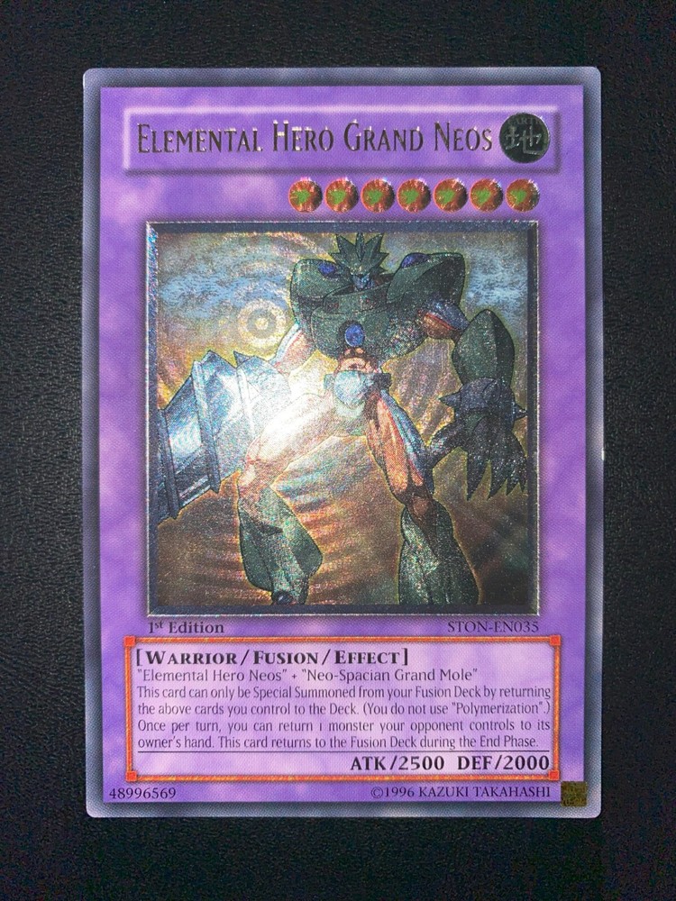 This Ultimate Rare Grand Neos is a must-have for any serious Yu-Gi-Oh! collector! The card is in excellent condition with crisp edges and vibrant artwork that really pops in the light. As a 1st Edition from STON, it's incredibly rare and a true gem for Hero deck enthusiasts. The Ultimate Rare foil gives it that premium holographic shine that makes it stand out in any collection. Perfect for both play and display, this is one of those special cards that keeps gaining value over time. Highly recommended for fans of the Elemental Hero series!