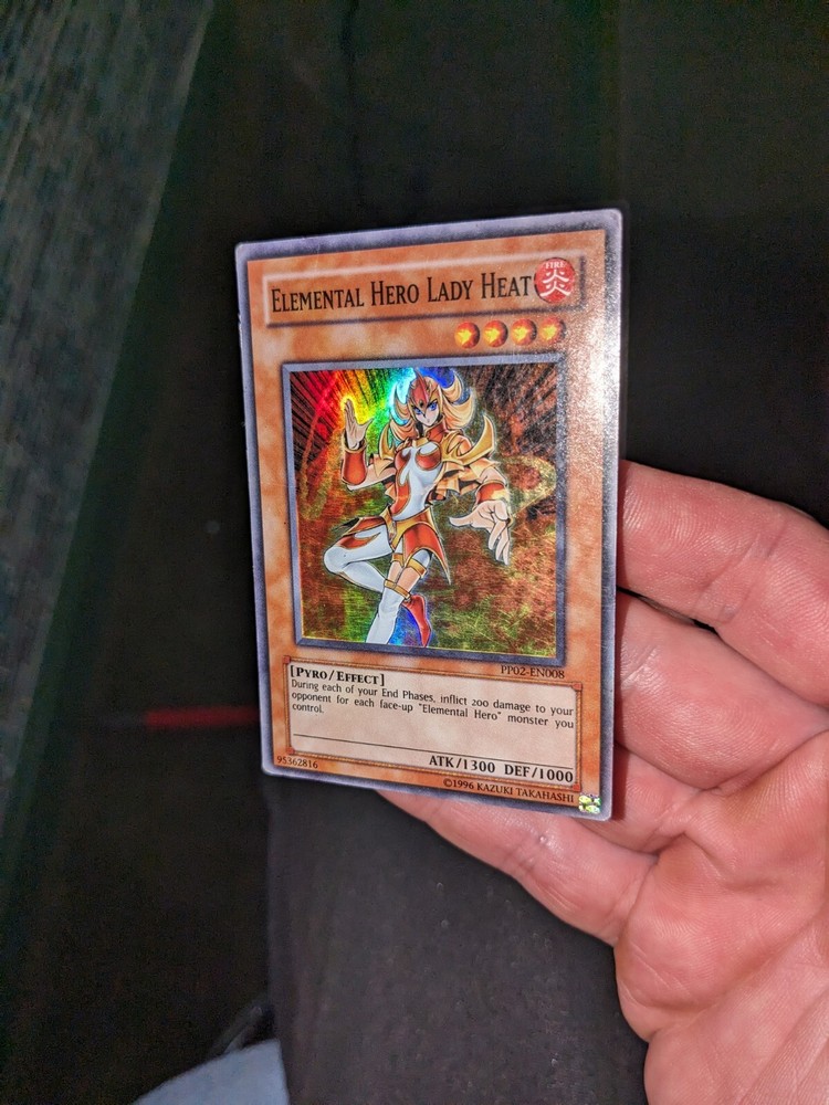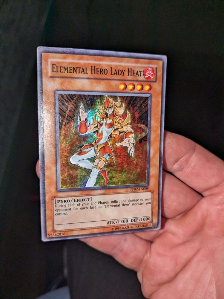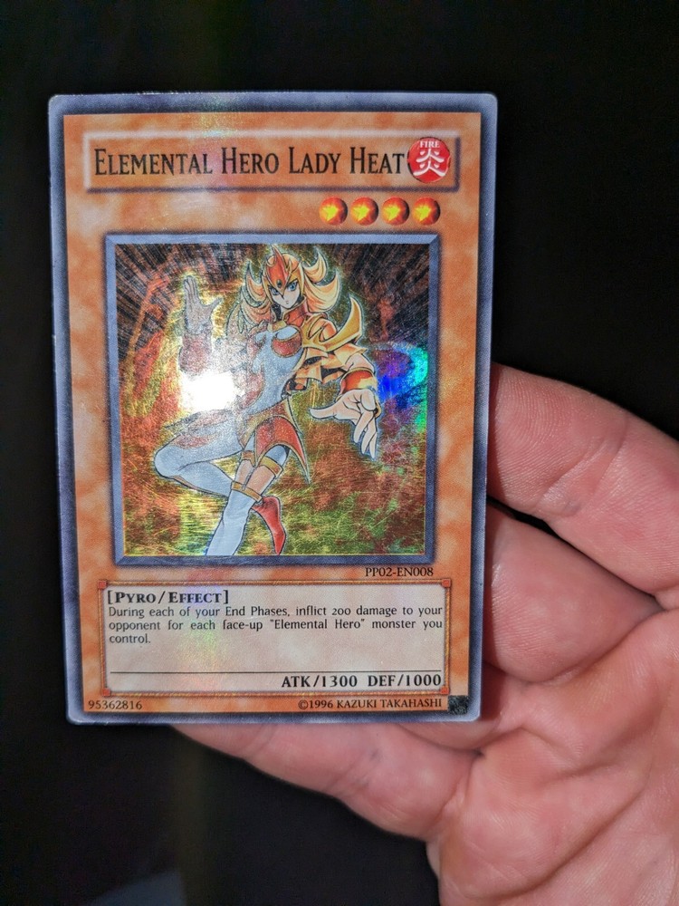 This is a rare Yu-Gi-Oh! TCG Elemental Hero Lady Heat card that features a Light attribute and is a 1st Edition. The card's condition type is ungraded and it has been moderately played, but still in very good condition. Made of metal, this collectible card is a must-have for any fan of the game.