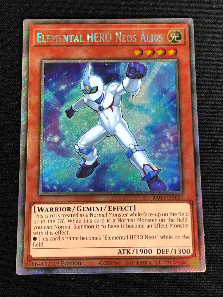 YUGIOH ELEMENTAL HERO NEOS ALIUS RA03-EN184 1ST PLATINUM SECRET ALL CARDS IN THIS AUCTION ARE IN NEAR MINT TO MINT CONDITION UNLESS STATED OTHERWISE IN THE TITLE. AND, YOU ARE GUARANTEED TO RECEIVE THE CARD NAMED IN THE TITLE. PLEASE NOTE, IF THERE'S MORE THAN 1 COPY AVAILABLE, YOU MAY NOT RECIEVE THE SAME EXACT CARD IN THE PHOTO. HOWEVER, IT WILL BE THE SAME EXACT CARD IN THE TITLE, AND DESCRIPTION! PLEASE CONTACT ME IF THERE IS ANYTHING WRONG WITH YOUR ORDER OR SHIPPING BEFORE LEAVING FEEDBACK. PLEASE GIVE ME A CHANCE TO FIX ANY PROBLEM YOU MAY HAVE. THANK YOU! Shipping Information: Shipping and Handling for this auction will be Free inside the United States - With Tracking! International Shipping Available Through Ebay’s Global Shipping Program. (BUYER IS RESPONSIBLE FOR ANY TAX) **Read the TITLE to see the condition of the cards Before you place a bid. Any damaged cards will be listed as such In The Title (FOR EXAMPLE: Blue Eyes White Dragon LOB-001 (HP) If it doesn't say anything about damage, it is in near-mint to mint condition. If you have any questions, message me Before you place your bid.** *PLEASE READ* Ebay's Card Condition Guidelines: (NM) = Near mint or better Comparable to a fresh pack Flaws may include Minor corner and edge wear (LP) = Lightly played (Excellent) Has clearly visible signs of wear Flaws may include Moderate edge chipping Moderate surface scuffing Fuzzy corners (MP) = Moderately played (Very good) Has moderate-to-heavy damage all over Flaws may include Moderate discoloration Moderate creasing Moderate to heavy edge chipping Rounding and soft corner (HP) = Heavily played (Poor) Is extremely worn and displays flaws all over Heavily Played condition cards exhibit signs of heavy wear. Heavily Played condition cards may include cards that have significant creasing, folding, severe water damage, heavy whitening, heavy border wear, and/or tearing. RETURN POLICY: RETURNS ARE ACCEPTED IF THE ITEM ARRIVES DAMAGED, OR NOT AS DESCRIBED. RETURNS ARE NOT ACCEPTED FOR BUYERS REMORSE. CHECK OUT MY OTHER AUCTIONS! _gsrx_vers_1680 (GS 9.8.3 (1680))
