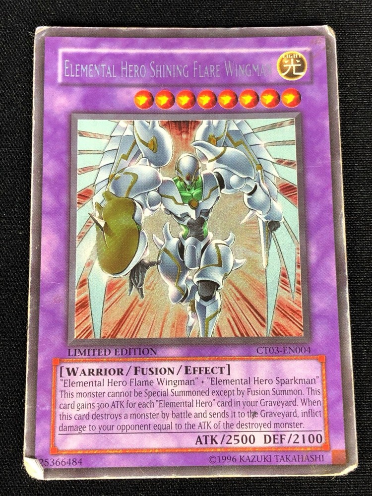 YUGIOH ELEMENTAL HERO SHINING FLARE WINGMAN CT03-EN004 SECRET (HP) ALL CARDS IN THIS AUCTION ARE IN NEAR MINT TO MINT CONDITION UNLESS STATED OTHERWISE IN THE TITLE. AND, YOU ARE GUARANTEED TO RECEIVE THE CARD NAMED IN THE TITLE. PLEASE NOTE, IF THERE'S MORE THAN 1 COPY AVAILABLE, YOU MAY NOT RECIEVE THE SAME EXACT CARD IN THE PHOTO. HOWEVER, IT WILL BE THE SAME EXACT CARD IN THE TITLE, AND DESCRIPTION! PLEASE CONTACT ME IF THERE IS ANYTHING WRONG WITH YOUR ORDER OR SHIPPING BEFORE LEAVING FEEDBACK. PLEASE GIVE ME A CHANCE TO FIX ANY PROBLEM YOU MAY HAVE. THANK YOU! Shipping Information: Shipping and Handling for this auction will be Free inside the United States - With Tracking! International Shipping Available Through Ebay’s Global Shipping Program. (BUYER IS RESPONSIBLE FOR ANY TAX) **Read the TITLE to see the condition of the cards Before you place a bid. Any damaged cards will be listed as such In The Title (FOR EXAMPLE: Blue Eyes White Dragon LOB-001 (HP) If it doesn't say anything about damage, it is in near-mint to mint condition. If you have any questions, message me Before you place your bid.** *PLEASE READ* Ebay's Card Condition Guidelines: (NM) = Near mint or better Comparable to a fresh pack Flaws may include Minor corner and edge wear (LP) = Lightly played (Excellent) Has clearly visible signs of wear Flaws may include Moderate edge chipping Moderate surface scuffing Fuzzy corners (MP) = Moderately played (Very good) Has moderate-to-heavy damage all over Flaws may include Moderate discoloration Moderate creasing Moderate to heavy edge chipping Rounding and soft corner (HP) = Heavily played (Poor) Is extremely worn and displays flaws all over Heavily Played condition cards exhibit signs of heavy wear. Heavily Played condition cards may include cards that have significant creasing, folding, severe water damage, heavy whitening, heavy border wear, and/or tearing. RETURN POLICY: RETURNS ARE ACCEPTED IF THE ITEM ARRIVES DAMAGED, OR NOT AS DESCRIBED. RETURNS ARE NOT ACCEPTED FOR BUYERS REMORSE. CHECK OUT MY OTHER AUCTIONS! _gsrx_vers_1680 (GS 9.8.3 (1680))