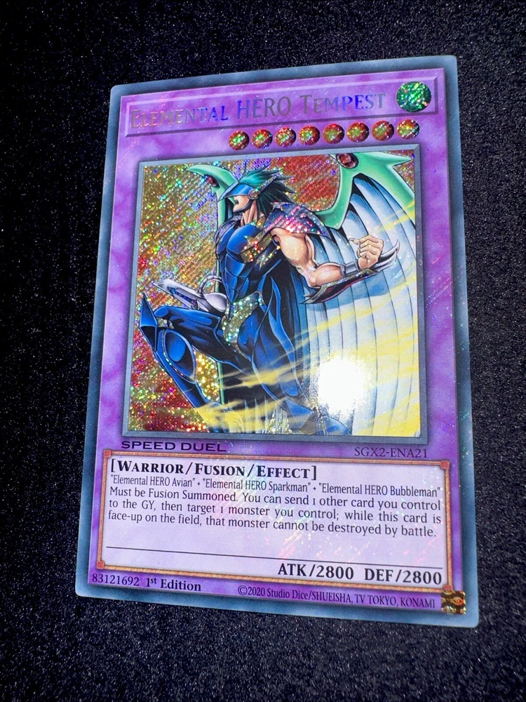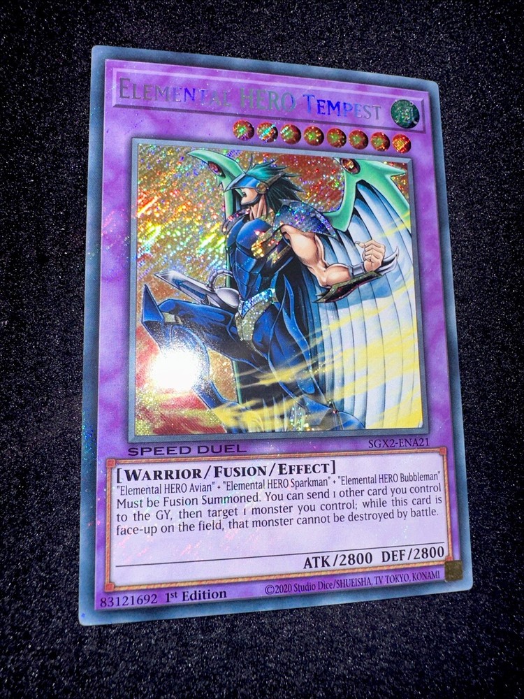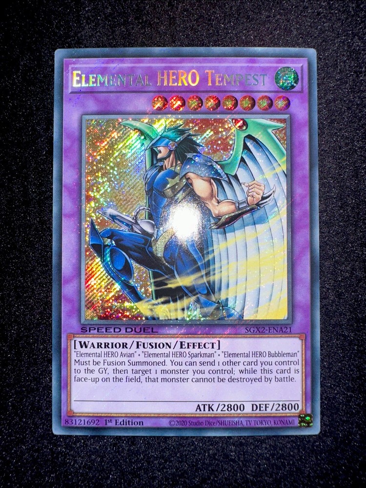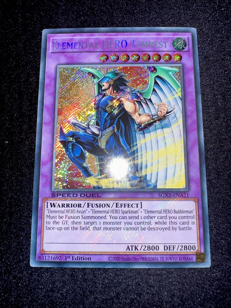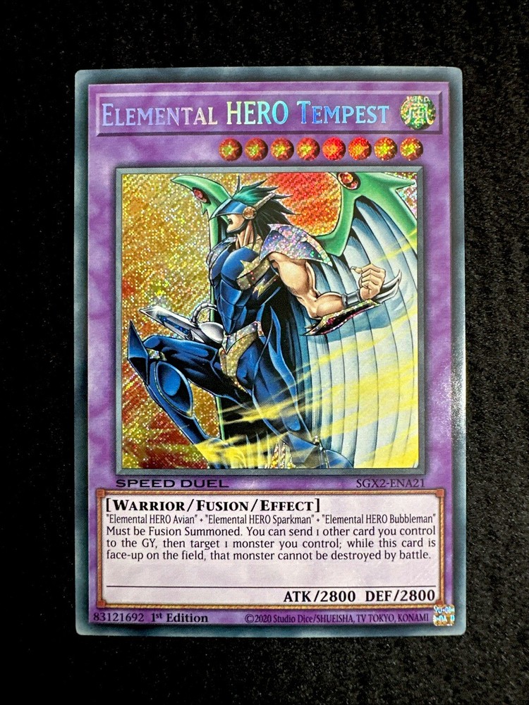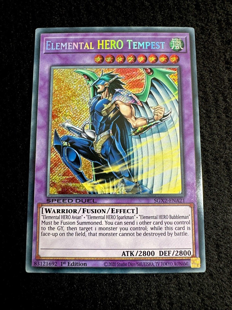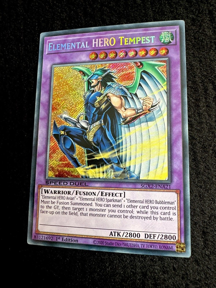 🔥 YUGIOH • ELEMENTAL HERO TEMPEST • SECRET RARE • SGX2-ENA21 • 1st • NM 🔥 Card Sleeve Included + Top Loader • Never Play Near Mint card • Authentic Konami USA Version YOU ARE GUARANTEED TO GET THE CARD NAMED IN THE TITLE. Thank you.