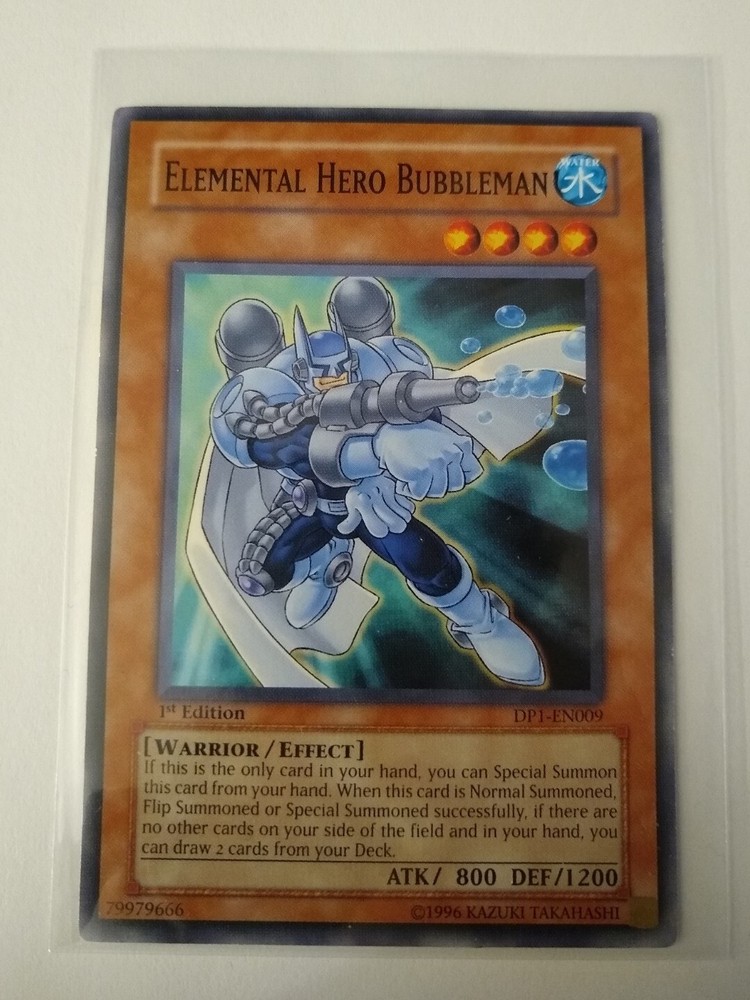 YU-GI-OH! Trading Card Game. TCG CCG. Elemental Hero Bubbleman. DP1-EN009. 1st Edition Card. This Card is Near Mint. Check Pics for Condition. Ships USPS. All Cards Will Be Shipped in a Penny Sleeve and a Premium Semi-Rigid Card Holder for Protection.