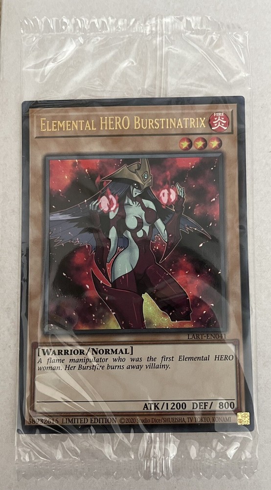 You are bidding on: 1x Elemental Hero Burstinatrix LART-EN041 Ultra Rare Limited Edition SEALED Any questions please don’t hesitate to ask. Photos are of the card you will receive but it may not be the exact card due to quantity of each item. Thanks for looking please check my other auctions out. Happy buying. Returns will not be accepted if the item you purchased has changed in value since purchase due to reprint announcement, or if the card is returned is worse condition that originally sent in.