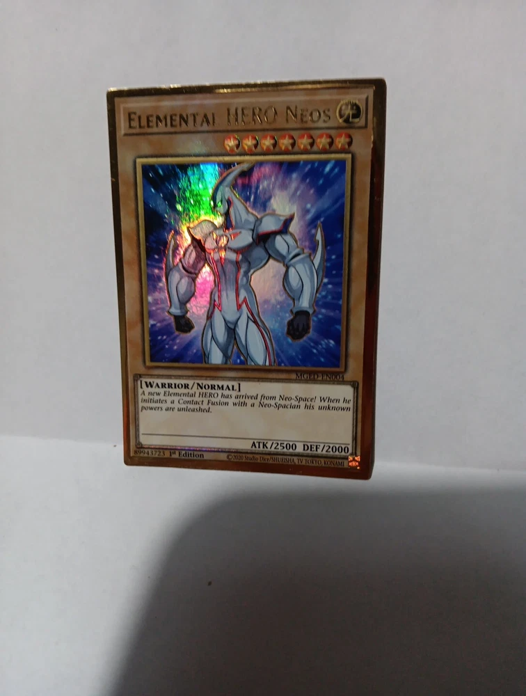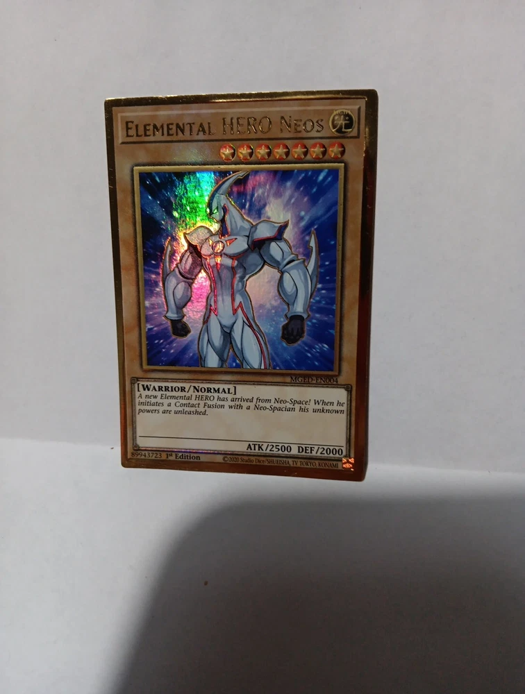 This Yu-Gi-Oh! TCG card features Elemental HERO Neos, a powerful Warrior monster with 2500 ATK and 2000 DEF. The card is from the Maximum Gold: El Dorado set and is a Premium Gold Rare 1st Edition. It has a Japanese card size and an English language. The card is lightly played and in excellent condition, with a foil finish. The card's manufacturer is Konami, and it has features such as being ungraded and having the card number MGED-EN004. This card is perfect for fans of Yu-Gi-Oh! who want to add a powerful and rare card to their collection.