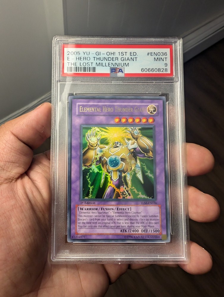 The Yu-Gi-Oh! TCG card name is Elemental Hero Thunder Giant, with a TLM-EN036 Ulra Rare edition. This collectible card is perfect for fans of the game and collectors of rare items....