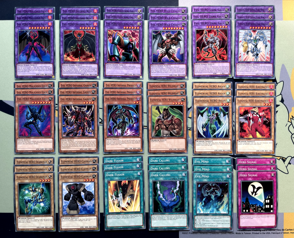 YUGIOH Evil Hero / Elemental Hero SGX3 54 Cards Deck Core 1st Edition - Brand New / Near Mint Condition Deck core contains the following: FUSION MONSTERS: Evil HERO Malicious Fiend (Common) x3 Evil HERO Inferno Wing (Common) x3 Evil HERO Lightning Golem (Common) x3 Evil HERO Wild Cyclone (Common) x3 Evil HERO Dark Gaia (Common) x3 Elemental HERO Shining Flare Wingman (Common) x3 MONSTERS: Evil HERO Malicious Edge (Common) x3 Evil HERO Infernal Gainer (Common) x3 Evil HERO Infernal Prodigy (Common) x3 Elemental HERO Wildheart (Common) x3 Elemental HERO Avian (Common) x3 Elemental HERO Burstinatrix (Common) x3 Elemental HERO Sparkman (Common) x3 Elemental HERO Clayman (Common) x3 SPELLS: Dark Fusion (Common) x3 Dark Calling (Common) x3 Evil Mind (Common) x3 TRAPS: HERO Signal (Common) x3 If you have any questions, feel free to send me a message!