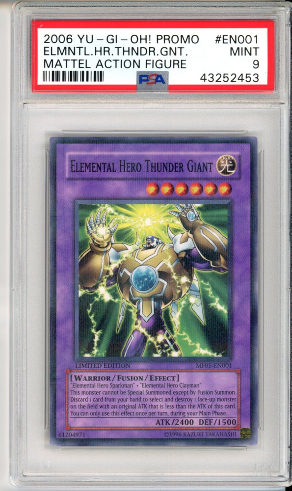Description Condition: PSA 9 MINT Availability: In Stock You are Purchasing YUGIOH MF01-EN001 ELEMENTAL HERO THUNDER GIANT PARALLEL RARE PSA 9 MINT #43252453 Professionally graded by Professional Sports Authenticator (PSA) *PLEASE REVIEW PHOTO(S) BEFORE BIDDING/BUYING. >>MORE GRADED YUGIOH CARDS<< IG: CARD_RUSH_INC Payment Options Payment is expected within 7 days of your purchase date. We accept all forms of payments through Paypal. Shipping and Handling We ship to all U.S. states, U.S. territories, APO/FPO locations and any international countries listed under our "ship to" heading. Shipping and Handling is calculated based on the combined shipping weight of your item(s). Please use the shipping calculator to estimate your shipping and handling charges. In order to qualify for combined shipping terms, all items must be paid for in one payment; please do not pay until you are done bidding/shopping. Please contact us if you have any questions regarding our shipping and handling terms. Shipping and Delivery Packages are shipped out every Monday, Wednesday, and Friday. Domestic Packages take approximately 2-7 days to arrive. International packages may take a little longer to arrive, typically 1-4 weeks. Please allow ample transit times before inquiring about your package, thank you. Sales Tax Sales tax will be automatically collected by Ebay. Customer Service We will make every effort to get your purchase is mailed in a timely manner. Please contact us if you have any questions or concerns; we would love to hear any suggestions you have on how we can improve your eBay experience. Thank you for visiting us today.
