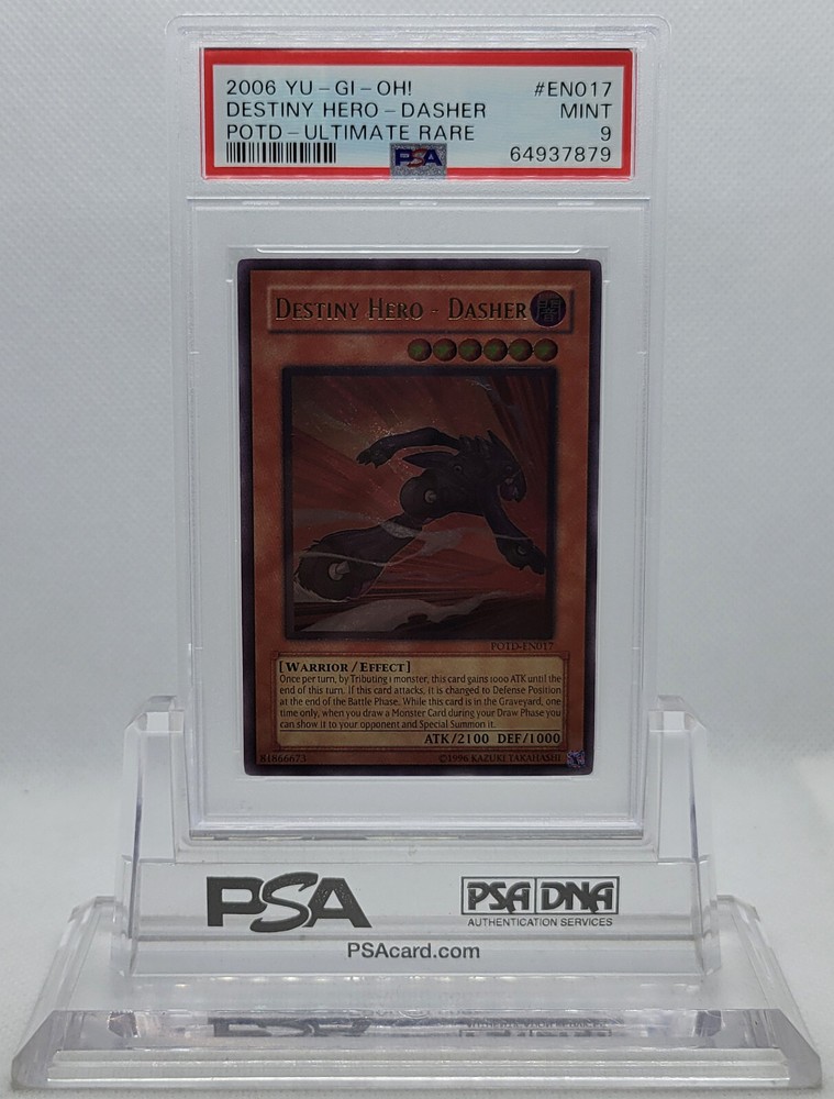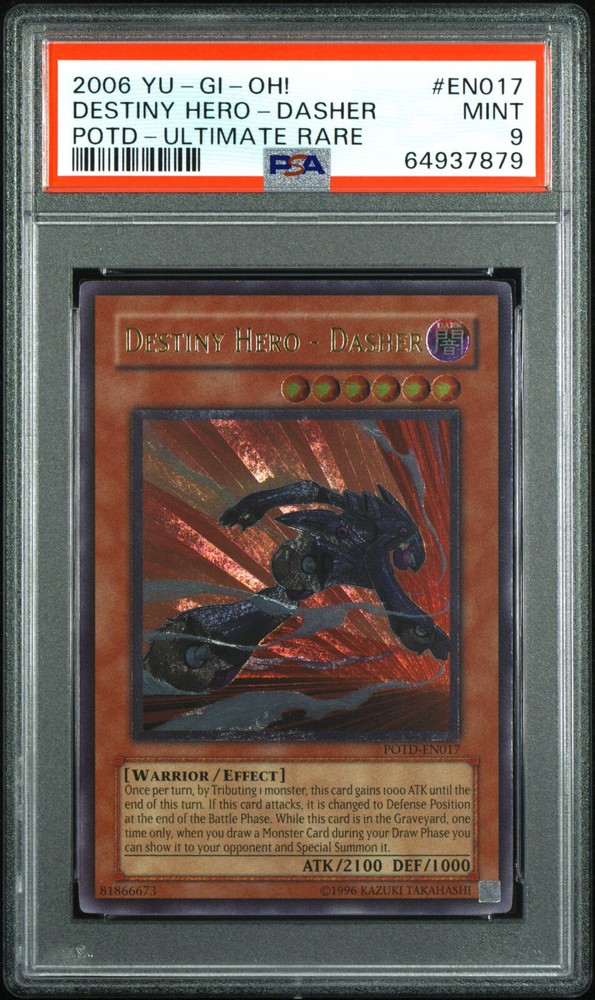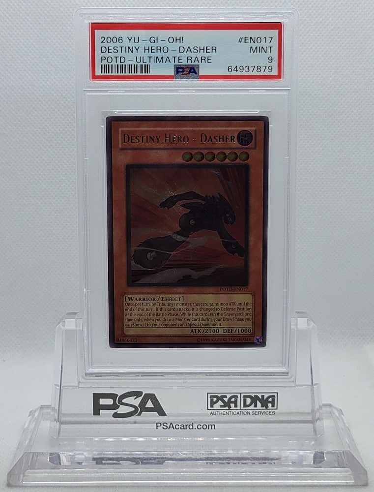 Description Condition: PSA 9 MINT Availability: In Stock You are Purchasing YUGIOH POTD-EN017 DESTINY HERO DASHER ULTIMATE RARE PSA 9 MINT #64937879 Professionally graded by Professional Sports Authenticator (PSA) *PLEASE REVIEW PHOTO(S) BEFORE BIDDING/BUYING. >>MORE GRADED YUGIOH CARDS<< IG: CARD_RUSH_INC Payment Options Payment is expected within 7 days of your purchase date. We accept all forms of payments through Paypal. Shipping and Handling We ship to all U.S. states, U.S. territories, APO/FPO locations and any international countries listed under our "ship to" heading. Shipping and Handling is calculated based on the combined shipping weight of your item(s). Please use the shipping calculator to estimate your shipping and handling charges. In order to qualify for combined shipping terms, all items must be paid for in one payment; please do not pay until you are done bidding/shopping. Please contact us if you have any questions regarding our shipping and handling terms. Shipping and Delivery Packages are shipped out every Monday, Wednesday, and Friday. Domestic Packages take approximately 2-7 days to arrive. International packages may take a little longer to arrive, typically 1-4 weeks. Please allow ample transit times before inquiring about your package, thank you. Sales Tax Sales tax will be automatically collected by Ebay. Customer Service We will make every effort to get your purchase is mailed in a timely manner. Please contact us if you have any questions or concerns; we would love to hear any suggestions you have on how we can improve your eBay experience. Thank you for visiting us today.