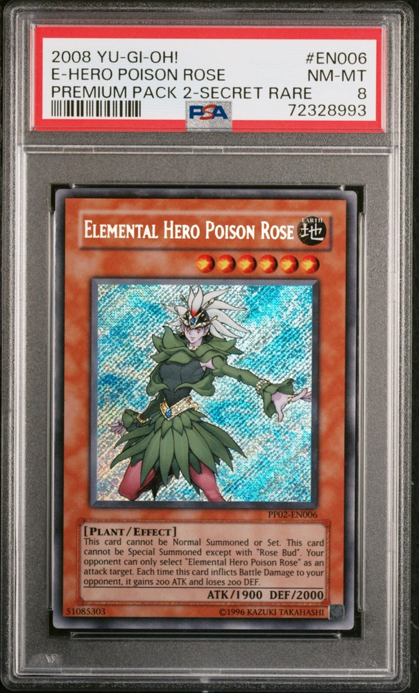 Description Condition: PSA 8 NM-MT Availability: In Stock You are Purchasing YUGIOH PP02-EN006 ELEMENTAL HERO POISON ROSE SECRET MISPRINT PSA 8 NM #72328993 Professionally graded by Professional Sports Authenticator (PSA) *PLEASE REVIEW PHOTO(S) BEFORE PURCHASING >>MORE GRADED YUGIOH CARDS<< Payment Options Payment is expected within 7 days of your purchase date. We accept all forms of payments through Paypal. Shipping and Handling We ship to all U.S. states, U.S. territories, APO/FPO locations and any international countries listed under our "ship to" heading. Shipping and Handling is calculated based on the combined shipping weight of your item(s). Please use the shipping calculator to estimate your shipping and handling charges. In order to qualify for combined shipping terms, all items must be paid for in one payment; please do not pay until you are done bidding/shopping. Please contact us if you have any questions regarding our shipping and handling terms. Shipping and Delivery Packages are shipped out every Monday, Wednesday, and Friday. Domestic Packages take approximately 2-7 days to arrive. International packages may take a little longer to arrive, typically 1-4 weeks. Please allow ample transit times before inquiring about your package, thank you. Sales Tax All orders shipped to a California address will be subject to Sales Tax. Sales Tax is calculated on the item's price and is not applied to the shipping or other charges. Customer Service We will make every effort to get your purchase is mailed in a timely manner. Please contact us if you have any questions or concerns; we would love to hear any suggestions you have on how we can improve your eBay experience. Thank you for visiting us today.