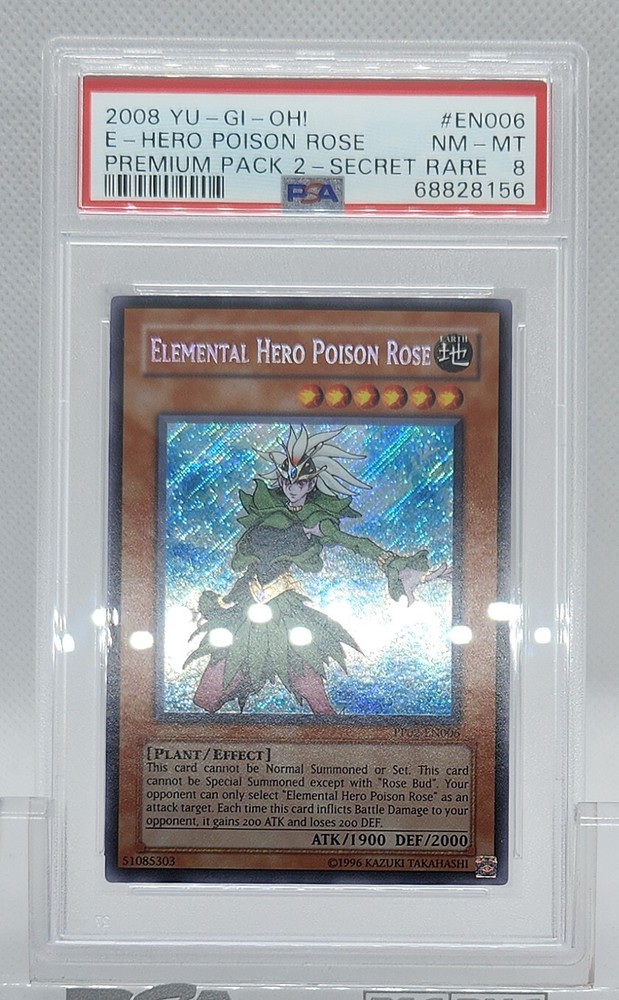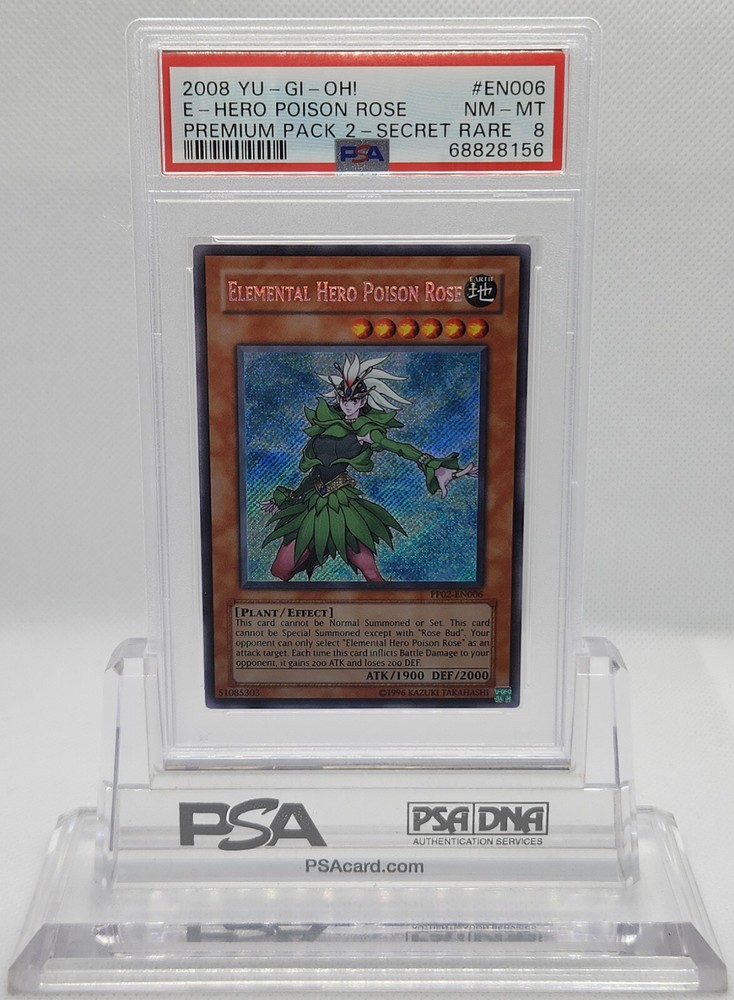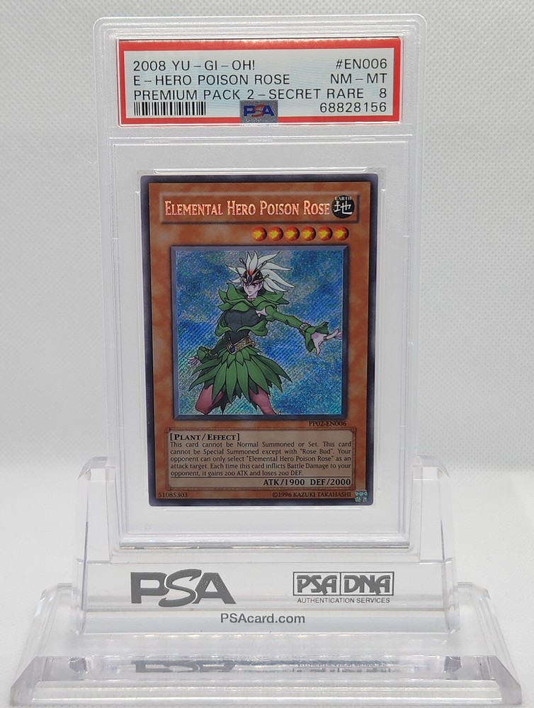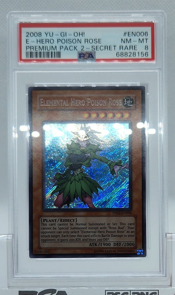 Description Condition: PSA 8 NM-MINT Availability: In Stock You are Purchasing YUGIOH PP02-EN006 ELEMENTAL HERO POISON ROSE SECRET RARE PSA 8 NM-MINT #68828156 Professionally graded by Professional Sports Authenticator (PSA) *PLEASE REVIEW PHOTO(S) BEFORE BIDDING/BUYING. >>MORE GRADED YUGIOH CARDS<< IG: CARD_RUSH_INC Payment Options Payment is expected within 7 days of your purchase date. We accept all forms of payments through Paypal. Shipping and Handling We ship to all U.S. states, U.S. territories, APO/FPO locations and any international countries listed under our "ship to" heading. Shipping and Handling is calculated based on the combined shipping weight of your item(s). Please use the shipping calculator to estimate your shipping and handling charges. In order to qualify for combined shipping terms, all items must be paid for in one payment; please do not pay until you are done bidding/shopping. Please contact us if you have any questions regarding our shipping and handling terms. Shipping and Delivery Packages are shipped out every Monday, Wednesday, and Friday. Domestic Packages take approximately 2-7 days to arrive. International packages may take a little longer to arrive, typically 1-4 weeks. Please allow ample transit times before inquiring about your package, thank you. Sales Tax Sales tax will be automatically collected by Ebay. Customer Service We will make every effort to get your purchase is mailed in a timely manner. Please contact us if you have any questions or concerns; we would love to hear any suggestions you have on how we can improve your eBay experience. Thank you for visiting us today.