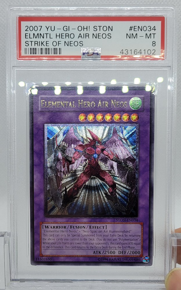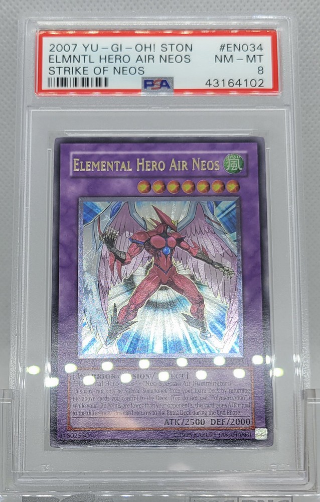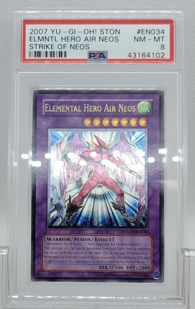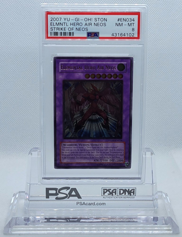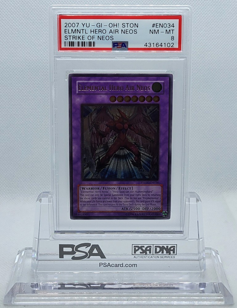 Description Condition: PSA 8 NM-MT Availability: In Stock You are Purchasing YUGIOH STON-EN034 ELEMENTAL HERO AIR NEOS ULTIMATE RARE PSA 8 NM-MT #43164102 Professionally graded by Professional Sports Authenticator (PSA) *PSA CERTIFICATE NUMBER MAY VARY FROM PHOTO(S). >>MORE GRADED YUGIOH CARDS<< Payment Options Payment is expected within 7 days of your purchase date. We accept all forms of payments through Paypal. Shipping and Handling We ship to all U.S. states, U.S. territories, APO/FPO locations and any international countries listed under our "ship to" heading. Shipping and Handling is calculated based on the combined shipping weight of your item(s). Please use the shipping calculator to estimate your shipping and handling charges. In order to qualify for combined shipping terms, all items must be paid for in one payment; please do not pay until you are done bidding/shopping. Please contact us if you have any questions regarding our shipping and handling terms. Shipping and Delivery Packages are shipped out every Monday, Wednesday, and Friday. Domestic Packages take approximately 2-7 days to arrive. International packages may take a little longer to arrive, typically 1-4 weeks. Please allow ample transit times before inquiring about your package, thank you. Sales Tax All orders shipped to a California address will be subject to Sales Tax. Sales Tax is calculated on the item's price and is not applied to the shipping or other charges. Customer Service We will make every effort to get your purchase is mailed in a timely manner. Please contact us if you have any questions or concerns; we would love to hear any suggestions you have on how we can improve your eBay experience. Thank you for visiting us today.