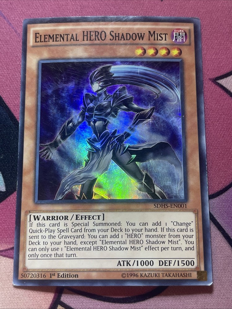 The product is a Yu-Gi-Oh! TCG card featuring Elemental Hero Shadow Mist with the card number SDHS-EN001. It is a Super Rare 1st Edition card...