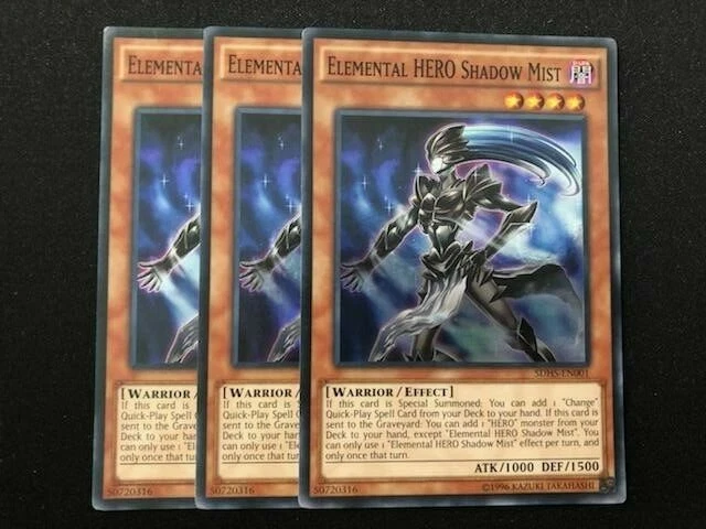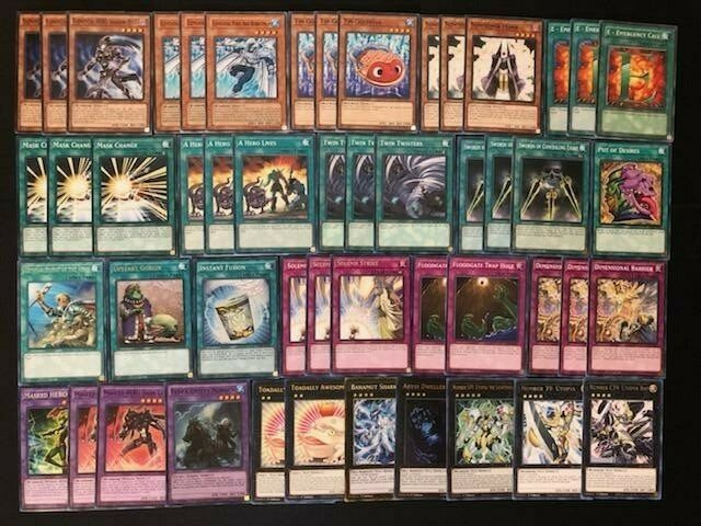 MONSTERS: 3X ELEMENTAL HERO SHADOW MIST (SUPER RARE) 3X ELEMENTAL HERO NEO BUBBLEMAN (COMMON) 3X TIN GOLDFISH (COMMON) 3X SUMMONER MONK (COMMON) SPELLS: 3X E - EMERGENCY CALL (COMMON) 3X MASK CHANGE (COMMON) 3X A HERO LIVES (COMMON) 3X TWIN TWISTERS (COMMON) 3X SWORDS OF CONCEALING LIGHT (COMMON) 1X POT OF DEIRES (COMMON) 1X REINFORCEMENT OF THE ARMY (RARE) 1X UPSTART GOBLIN (GOLD RARE) 1X INSTANT FUSION (SUPER RARE) TRAPS: 3X SOLEMN STRIKE (RARE) \2X FLOODGATE TRAP HOLE (COMMON) 3X DIMENSIONAL BARRIER (COMMON) EXTRA DECK: 1X ELDER ENTITY NORDEN (SUPER RARE) 2X MASKED HERO DARK LAW (COMMON) 1X MASKED HERO BLAST (RARE) 2X TOADALLY AWESOME (GOLD RARE) 1X BAHAMUT SHARK (GOLD SECRET RARE) 1X ABYSS DWELLER (ULTRA RARE) 1X NUMBER S39: UTOPIA THE LIGHTNING (ULTRA RARE) 1X NUMBER 39: UTOPIA (RARE) 1X NUMBER C39: UTOPIA RAY (RARE)
