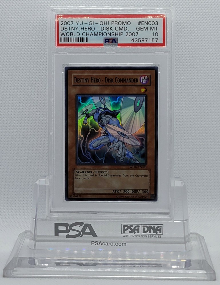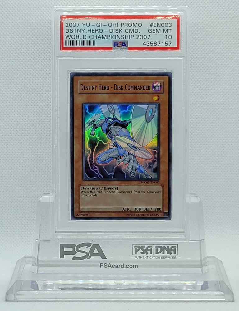 Description Condition: PSA 10 GEM MINT Availability: In Stock You are Purchasing YUGIOH WC07-EN003 DESTINY HERO DISK COMMANDER SUPER RARE HOLO PSA 10 GEM MINT #* Professionally graded by Professional Sports Authenticator (PSA) *PSA CERTIFICATE NUMBER MAY VARY FROM PHOTO(S) >>MORE GRADED YUGIOH CARDS<< IG: CARD_RUSH_INC Payment Options Payment is expected within 2 weeks of your purchase date. We accept all forms of payments through Paypal. Shipping and Handling We ship to all U.S. states, U.S. territories, APO/FPO locations and any international countries listed under our "ship to" heading. Shipping and Handling is calculated based on the combined shipping weight of your item(s). Please use the shipping calculator to estimate your shipping and handling charges. In order to qualify for combined shipping terms, all items must be paid for in one payment; please do not pay until you are done bidding/shopping. Please contact us if you have any questions regarding our shipping and handling terms. Shipping and Delivery Packages are shipped out every Monday, Wednesday, and Friday. Domestic Packages take approximately 2-7 days to arrive. International packages may take a little longer to arrive, typically 1-4 weeks. Please allow ample transit times before inquiring about your package, thank you. Sales Tax Sales tax will be automatically collected by Ebay. Customer Service We will make every effort to get your purchase is mailed in a timely manner. Please contact us if you have any questions or concerns; we would love to hear any suggestions you have on how we can improve your eBay experience. Thank you for visiting us today.
