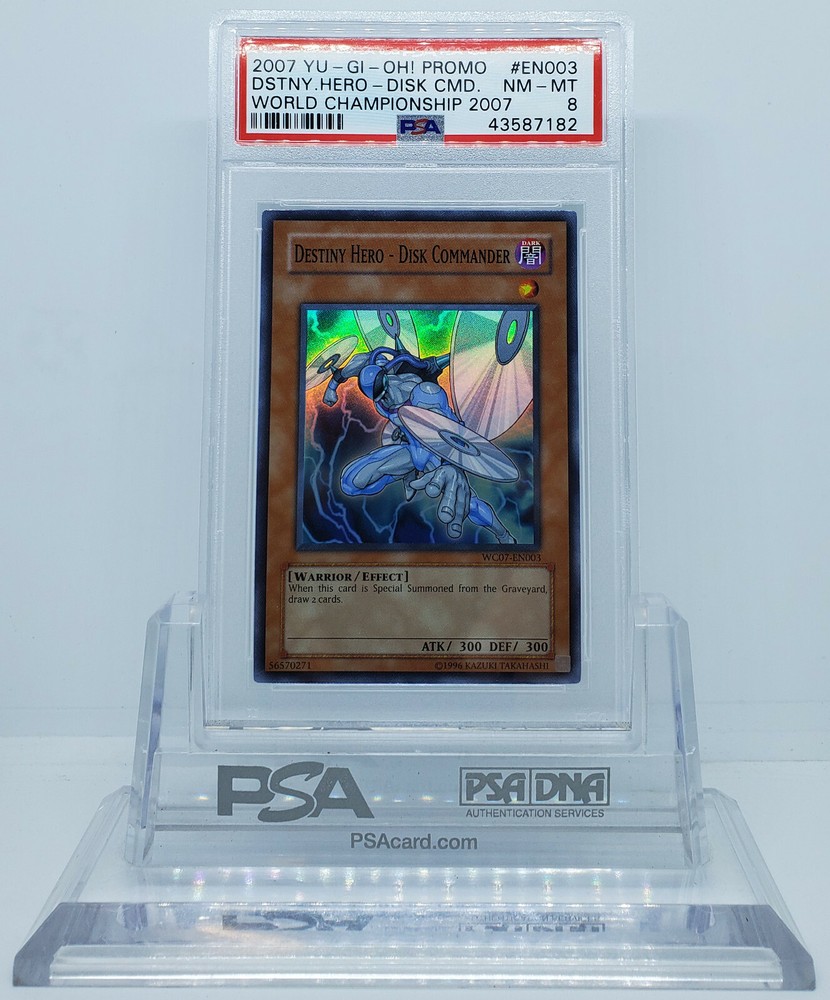 Description Condition: PSA 8 NM-MINT Availability: In Stock You are Purchasing YUGIOH WC07-EN003 DESTINY HERO DISK COMMANDER SUPER RARE HOLO PSA 8 NM-MINT #* Professionally graded by Professional Sports Authenticator (PSA) *PSA CERTIFICATE NUMBER MAY VARY FROM PHOTO(S). >>MORE GRADED YUGIOH CARDS<< Payment Options Payment is expected within 7 days of your purchase date. We accept all forms of payments through Paypal. Shipping and Handling We ship to all U.S. states, U.S. territories, APO/FPO locations and any international countries listed under our "ship to" heading. Shipping and Handling is calculated based on the combined shipping weight of your item(s). Please use the shipping calculator to estimate your shipping and handling charges. In order to qualify for combined shipping terms, all items must be paid for in one payment; please do not pay until you are done bidding/shopping. Please contact us if you have any questions regarding our shipping and handling terms. Shipping and Delivery Packages are shipped out every Monday, Wednesday, and Friday. Domestic Packages take approximately 2-7 days to arrive. International packages may take a little longer to arrive, typically 1-4 weeks. Please allow ample transit times before inquiring about your package, thank you. Sales Tax All orders shipped to a California address will be subject to Sales Tax. Sales Tax is calculated on the item's price and is not applied to the shipping or other charges. Customer Service We will make every effort to get your purchase is mailed in a timely manner. Please contact us if you have any questions or concerns; we would love to hear any suggestions you have on how we can improve your eBay experience. Thank you for visiting us today.