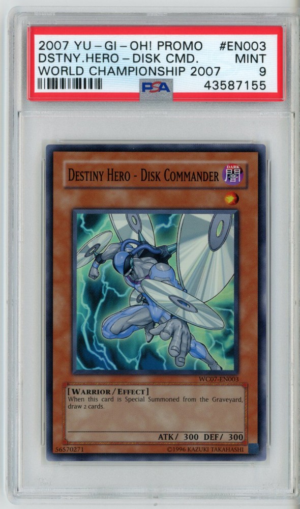 Description Condition: PSA 9 MINT Availability: In Stock You are Purchasing YUGIOH WC07-EN003 DESTINY HERO DISK COMMANDER SUPER RARE HOLPSA 9 MINT #43587155 Professionally graded by Professional Sports Authenticator (PSA) *PSA CERTIFICATE NUMBER MAY VARY FROM PHOTO(S). >>MORE GRADED YUGIOH CARDS<< Payment Options Payment is expected within 7 days of your purchase date. We accept all forms of payments through Paypal. Shipping and Handling We ship to all U.S. states, U.S. territories, APO/FPO locations and any international countries listed under our "ship to" heading. Shipping and Handling is calculated based on the combined shipping weight of your item(s). Please use the shipping calculator to estimate your shipping and handling charges. In order to qualify for combined shipping terms, all items must be paid for in one payment; please do not pay until you are done bidding/shopping. Please contact us if you have any questions regarding our shipping and handling terms. Shipping and Delivery Packages are shipped out every Monday, Wednesday, and Friday. Domestic Packages take approximately 2-7 days to arrive. International packages may take a little longer to arrive, typically 1-4 weeks. Please allow ample transit times before inquiring about your package, thank you. Sales Tax All orders shipped to a California address will be subject to Sales Tax. Sales Tax is calculated on the item's price and is not applied to the shipping or other charges. Customer Service We will make every effort to get your purchase is mailed in a timely manner. Please contact us if you have any questions or concerns; we would love to hear any suggestions you have on how we can improve your eBay experience. Thank you for visiting us today.