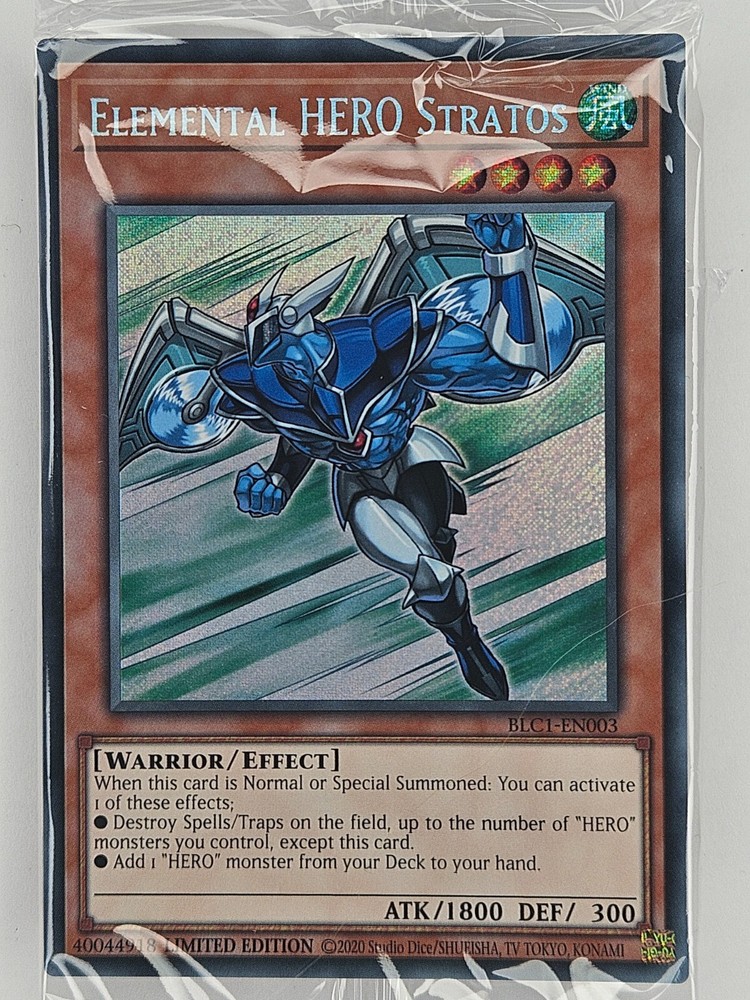 Unleash the power of the elements with the Yu-Gi-Oh! TCG's Elemental Hero Stratos from the Battles of Legend: Chapter 1 set. This Secret Rare card, numbered BLC1-EN003, features a striking foil finish that's sure to catch the eye of any collector or duelist. Manufactured by Konami, this card is a must-have for those looking to enhance their deck with a powerful Effect-type hero. Sealed for freshness and authenticity, this Elemental Hero Stratos comes straight from the factory, preserving its pristine quality and collectability. Whether you're aiming to collect, compete, or simply appreciate the art of the game, this card is a standout addition to any Yu-Gi-Oh! TCG assortment. This card is factory sealed.