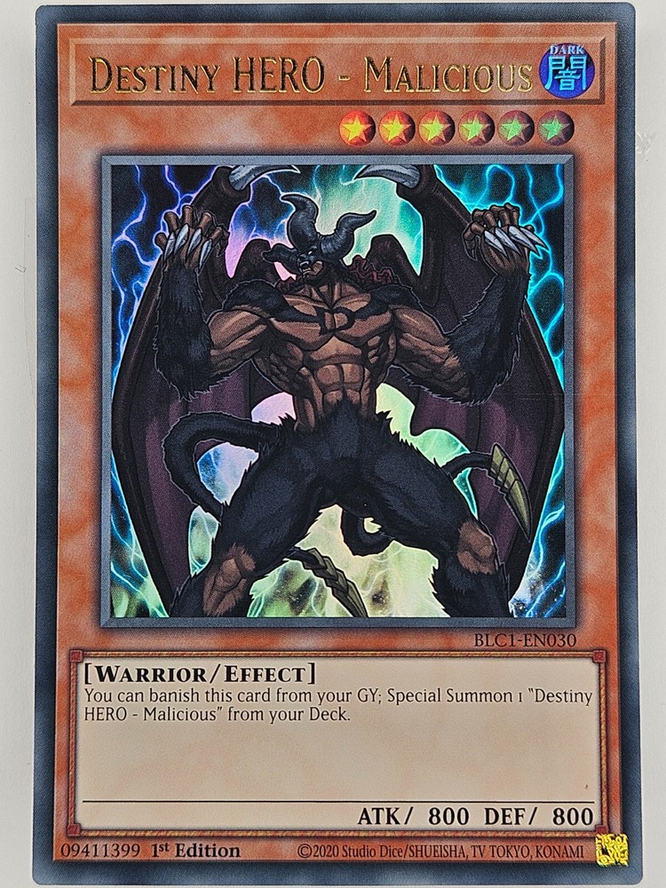Elevate your Yu-Gi-Oh! TCG collection with the Destiny Hero - Malicious card from the Battles of Legend: Chapter 1 set. This card, denoted by the code BLC1-EN030, features a striking gold foil finish that encapsulates the essence of its 'Gold' series heritage. As an effect-type card, it brings dynamic gameplay options to the table, enhancing both strategic depth and visual appeal with its ultra-rare status. Konami, the renowned manufacturer, ensures the highest quality and design for this collectible card. The foil finish not only shines but also protects the card from wear, maintaining its pristine appearance. Whether for play or display, the Destiny Hero - Malicious is a must-have for enthusiasts and collectors alike. This card was pulled wearing gloves.