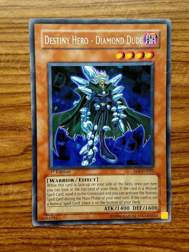This is for Yu-Gi-Oh! 1st Edition EOJ-EN003 "Destiny HERO - Diamond Dude" NM-M picture taken and securely packed for shipping. All cards are highly collectable , Each card will come with 2 randomly picked cards (3 cards in total) thank you. International Buyers – Please Note: · Import duties, taxes and charges are not included in the item price or shipping charges. These charges are the buyer's responsibility. · Please check with your country's customs office to determine what these additional costs will be prior to bidding/buying. · These charges are normally collected by the delivery freight (shipping) company or when you pick the item up – do not confuse them for additional shipping charges. · If the buyer refuses to pay customs and returns the item, you will not be refunded shipping charges · We do not mark merchandise values below value or mark items as "gifts" - US and International government regulations prohibit such behavior. Accidental Purchase/ Buyer’s Remorse: · Accidental Purchase are no longer Acceptable. · A buyer must request to cancel a transaction within 1 hour of purchasing item(s), We have 3 days to approve or decline this request. · If request is declined all sales are a binding contract and buyers will have to honor the sale, eBay will be notified as well. · If we approve the cancellation request and the buyer has already paid for the item we will refund within 10 days , Thank you. Attention buyers: All Items we have are kept in a windowless/ smoke-free building/House this mean that people who smoke cannot smoke inside or around the area. Prior to items coming to us may indeed come from a smoker(s) unfortunately we are not responsible or have control over that, thank you. Chargebacks and Payment Dispute: Due to an unexpected increase in chargebacks and payment disputes caused by dishonest and questionable buyers, we have decided to discontinue accepting inbox deals and making offers. We will exclusively be utilizing site coupons moving forward. Any inbox offers will be disregarded and deleted , and only serious inquiries will receive a response . Thank you.