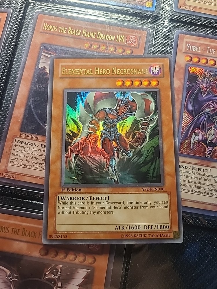 This rare Yu-Gi-Oh! card features the Elemental HERO Necroshade character and is part of the 1st Edition set. The card has the number YSDJ-EN000 and has a Light attribute. It is an original and vintage card from 1996, making it a great addition to any collection. The card size is 3¼" x 2¼" and it is not autographed. It is in unspecified condition but is part of the Yu-Gi-Oh! franchise. The card is perfect for any fan of the collectible card game or for those who collect vintage items.