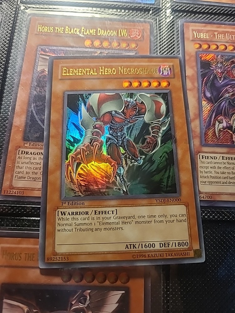 This rare Yu-Gi-Oh! card from the 1st Edition set features the Elemental HERO Necroshade character in a stunning design. The card is in its original form and has not been autographed or reprinted. It is a must-have for any Yugioh collector and fan. The card size is 3¼" x 2¼" and has the card number YSDJ-EN000. It was manufactured in 1996 and is a vintage item, making it a valuable addition to any collection. The card is in excellent condition and is perfect for playing or displaying. Don't miss out on the chance to own this amazing Yu-Gi-Oh! card.