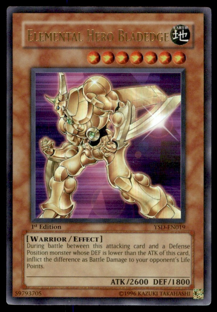 About Me Other Listings Feedback Add to Favorites Contact Me Bluenose Yu-Gi-Oh! 1st Edition Elemental Hero Bladedge #YSD-EN019 Light Play No stock photo / These are real scans or pictures Details Description: Elemental Hero Bladedge Category: Yugioh Year: 1996 Product: Yu-Gi-Oh! Set: 1st Edition Card Number: YSD-EN019 Special: Light Play Dimensions: 3¼" x 2¼" SKU: YU B0001 R01 F (21) Payment Payment for buy it now is required immediately and for auctions it must be paid within 72 hours. Shipping Shipments usually make their way out in 3 business days. All orders to USA under 800$ USD typically are NOT subject to import or duty! We also offer free shipping on all our cards for north america. Returns and Claims Please view listing photo and description prior to purchase of card to make sure the card and condition is right for you! About Us Please keep in mind the following conditions .-------------------------------------------Near Mint: a card that shows very little to no signs of ware or usage such as very little whiting. -------------------------------------------Light Play: A card that shows signs of ware such as but not limited to whiting, slight bend or scratches. -------------------------------------------Heavy Play: A card that shows signs of ware, whiting, bending, creasing, folding or other various issues.-------------------------------------------Damaged: a card in very bad condition can have some or all of the above mentioned condition notes including peeling, stains, writing, etc.-------------------------------------------The photo in ads are the EXACT card you will recieve. Listing By Kronocard trading cards software v2.7.0.1