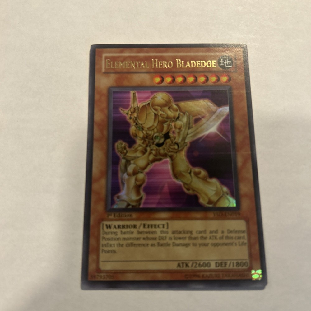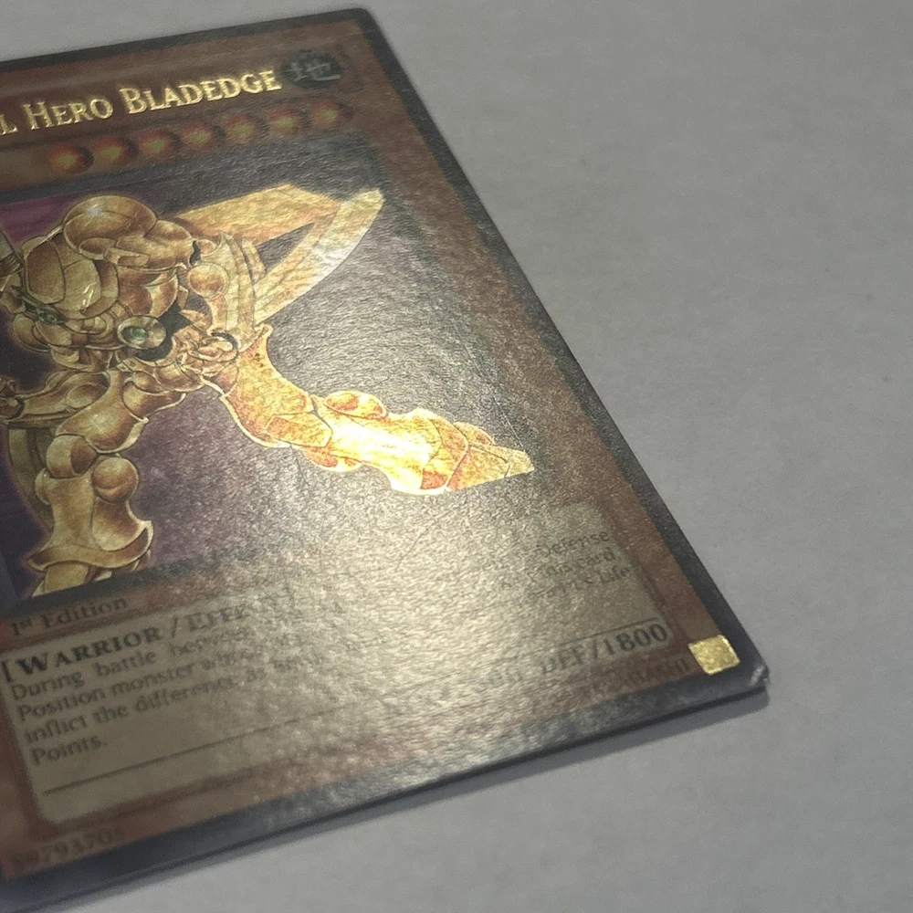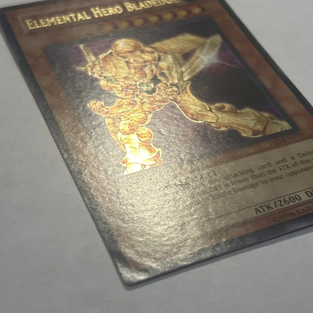Experience the nostalgia of the classic card game with this authentic Yu-Gi-Oh! 1st Edition Elemental Hero Bladedge card. Featuring the iconic character from the beloved franchise, this original card is a must-have for collectors and fans alike. The card is in light play condition, with no autographs or team specifications, adding to its vintage charm. Manufactured in 1996, this card is a testament to the early days of Yugioh. It measures the standard 3¼" x 2¼" and bears the card number YSD-EN019. With its unique Light attribute and pristine original design, this Elemental Hero Bladedge is a fantastic addition to any collection, bringing a piece of the game's history into your hands.