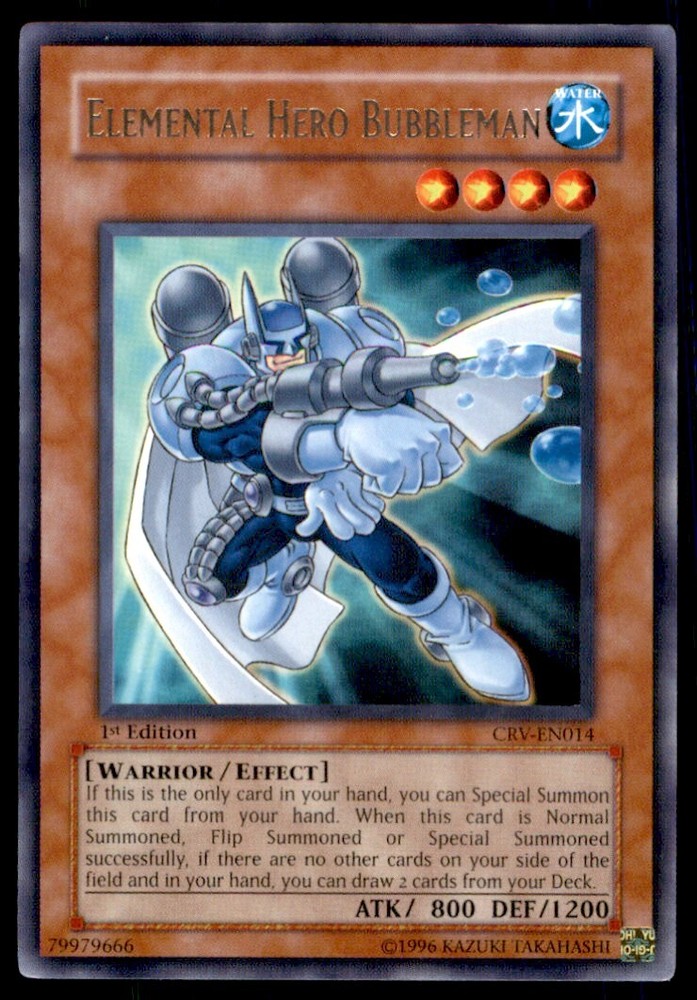 About Me Other Listings Feedback Add to Favorites Contact Me Bluenose Yu-Gi-Oh! 1st Edition Elemental Hero Bubbleman #CRV-EN014 Light Play No stock photo / These are real scans or pictures Details Description: Elemental Hero Bubbleman Category: Yugioh Year: 1996 Product: Yu-Gi-Oh! Set: 1st Edition Card Number: CRV-EN014 Special: Light Play Dimensions: 3¼" x 2¼" SKU: YU B0003 R04 C (29) Payment Payment for buy it now is required immediately and for auctions it must be paid within 72 hours. Shipping Shipments usually make their way out in 3 business days. All orders to USA under 800$ USD typically are NOT subject to import or duty! We also offer free shipping on all our cards for north america. Returns and Claims Please view listing photo and description prior to purchase of card to make sure the card and condition is right for you! About Us Please keep in mind the following conditions .-------------------------------------------Near Mint: a card that shows very little to no signs of ware or usage such as very little whiting. -------------------------------------------Light Play: A card that shows signs of ware such as but not limited to whiting, slight bend or scratches. -------------------------------------------Heavy Play: A card that shows signs of ware, whiting, bending, creasing, folding or other various issues.-------------------------------------------Damaged: a card in very bad condition can have some or all of the above mentioned condition notes including peeling, stains, writing, etc.-------------------------------------------The photo in ads are the EXACT card you will recieve. Listing By Kronocard trading cards software v2.7.0.1 Update ? March 3rd, 2025