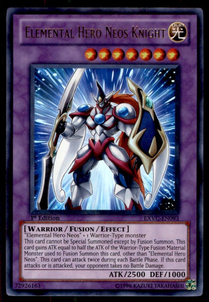 About Me Other Listings Feedback Add to Favorites Contact Me Bluenose Yu-Gi-Oh! 1st Edition Elemental Hero Neos Knight #EXVC-EN093 Near Mint No stock photo / These are real scans or pictures Details Description: Elemental Hero Neos Knight Category: Yugioh Year: 1996 Product: Yu-Gi-Oh! Set: 1st Edition Card Number: EXVC-EN093 Special: Near Mint Dimensions: 3¼" x 2¼" SKU: YU B0002 R02 R (33) Payment Payment for buy it now is required immediately and for auctions it must be paid within 72 hours. Shipping Shipments usually make their way out in 3 business days. All orders to USA under 800$ USD typically are NOT subject to import or duty! We also offer free shipping on all our cards for north america. Returns and Claims Please view listing photo and description prior to purchase of card to make sure the card and condition is right for you! About Us Please keep in mind the following conditions .-------------------------------------------Near Mint: a card that shows very little to no signs of ware or usage such as very little whiting. -------------------------------------------Light Play: A card that shows signs of ware such as but not limited to whiting, slight bend or scratches. -------------------------------------------Heavy Play: A card that shows signs of ware, whiting, bending, creasing, folding or other various issues.-------------------------------------------Damaged: a card in very bad condition can have some or all of the above mentioned condition notes including peeling, stains, writing, etc.-------------------------------------------The photo in ads are the EXACT card you will recieve. Listing By Kronocard trading cards software v2.7.0.1